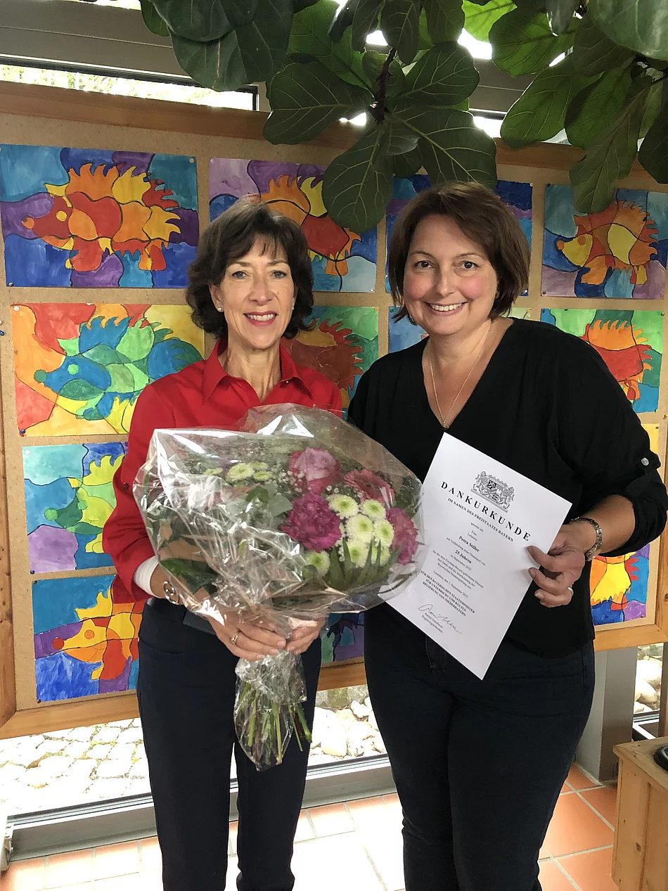 Bei einer kleinen Feierstunde im Kreise des Lehrerkollegiums wurde das 25jährige Dienstjubiläum von Frau Lehrerin Petra Stiller gefeiert. Frau Stiller beendete 1993 ihre Schullaufbahn am Tassilo Gymnasium Simbach erfolgreich mit dem Erlangen der Allgemeinen Hochschulreife. Daraufhin studierte sie an der LMU in München das Lehramt für Grundschulen und legte 1999 an der Grundschule Ering ihr zweites Staatsexamen ab. Es folgten Einsätze an den Grundschulen Zeilarn, Mitterskirchen, Simbach und Reut. Seit September 2020 gehört Frau Stiller dem Lehrerkollegium in Julbach an. Hier durfte Rektorin Katharina Hornung nun die Dankesurkunde des Freistaates Bayern überreichen und somit den Dank der Regierung von Niederbayern für 25 Jahre Schuldienst aussprechen. Die Schulleitung hob in der kurzen Ansprache besonders die große Motivation und den fleißigen Einsatz der Jubilarin hervor, die mit großem pädagogischen Geschick und Einfühlungsvermögen die Kinder auf ihrem Weg durch die Schulzeit begleitet. Zum Ausdruck der Verbundenheit überreichte die Rektorin verbunden mit den besten Wünschen für die Zukunft noch einen Blumenstrauß.