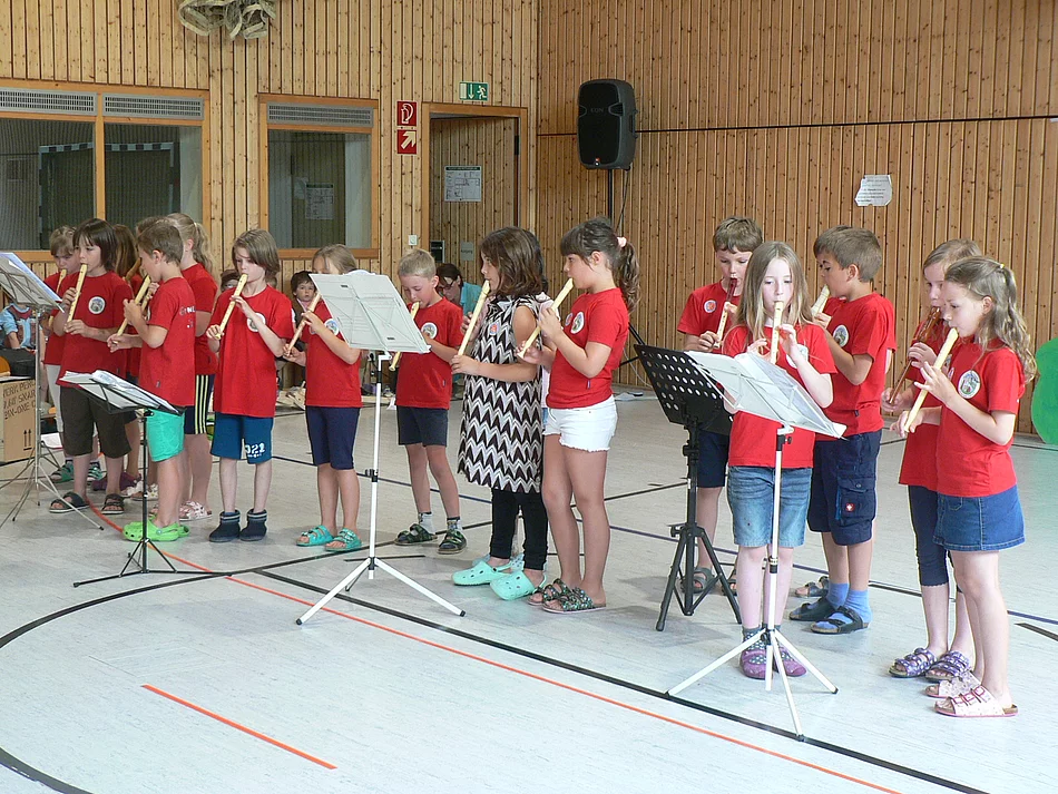 Musikalisch in die Ferien Der letzte Schultag vor den Pfingstferien stand ganz im Zeichen der Musik. Der „Aktionstag Musik“, der alljährlich von der Bayerischen Landeskoordinierungsstelle Musik und dem Kultusministerium ausgerufen wird, fand auch an der Grundschule Julbach in der Turnhalle statt. Viele Gäste waren der Einladung gefolgt zu diesem musikalischen Schulvormittag zu kommen. Zu Beginn sangen alle zusammen das Begrüßungslied „Key, Key, Kule“ aus Ghana. Karola Paster mit der 1. Klasse, der auch die Organisation des Aktionstages oblag, hatte dies eingeübt. Die lustigen Bewegungsübungen brachten gleich die zahlreich erschienene Gäste, zu denen auch 2. Bürgermeister Hans-Peter Brodschelm zählte, in die richtige Stimmung. Danach fanden die Aufführungen der Kindertagesstätte St. Michael statt. Gerlinde Schwarzmeier mit ihrem Team hatte mit den Kleinen ein großes Programm einstudiert. Vom Leben eines echten Cowboys nach der „Bonanzamelodie“ bis zu „Cotton Eyed Joe“, einem Lied für Lassoschwinger und einem mitreißenden Tanz über den Indianertanz am Lagerfeuer bis zum Lied übers Pferdereiten, reichten die Darbietungen der kleinen, wunderschön maskierten Kinder. Vollen Einsatz zeigte dann die 3. Klasse von Silvia Frank mit ihrem „KIKA Tanzalarm“ und kamen dabei ganz schön ins Schwitzen. Das Team der Wasserforscher aus der 1. und 4. Klasse zeigte den „Wasserrap“, ein Sprechstück mit Klanginstrumenten, das tropfende Wasserhähne beklagt. Gemeinsam sang die 1. Klasse das Lied „Der Uhu und die Unken“, begleitet von Lea Deragisch mit der Flöte und Sonja Schachtner, der Klassenlehrerin. Danach folgten die Solobeiträge von Lilly Sterneder auf der Melodika “Bergauf und bergab“ sowie „Ist ein Stein in Bach gefallen“. Von Lea Deragisch auf der Flöte hörte man „Polly Wolly Doodle“ und von Tobias Altmann auf der Gitarre „Kuckuck rufts aus dem Wald“. Alle Künstler stellten sich selbst vor und erzählten den Gästen, wie lange sie schon ihr Instrument lernen. „Das Bärenorchester“ so hieß das gemeinsame Lied der 2. Klasse. Dabei zeigten die Kinder der Reihe nach die Bären mit den verschiedensten Instrumenten eines richtigen Orchesters. Seit diesem Schuljahr erlernen die Kinder der 2. Klasse bei Sonja Schachtner das Flötenspiel. Ihre Premiere mit dem Stück „An die Freude“ spielten alle mit großer Sicherheit und gelang bereits sehr gut. Auch das zweite Stück „Gubben Noak“ ein sehr flottes Lied, wurde mit viel Applaus belohnt. Mutig vorgetragen wurden auch Liedbeiträge einzelner Gruppen. Sehr aktuell der Titel „80 Millionen“ mit Bongobegleitung präsentiert von Dominik Saß, Felix Grünleitner und Samuel Pahlke aus der 4. Klasse. Ihre Klassenkameradinnen Anna-Lena Tischler und Marion Werner wählten den gefühlvollen Song „Happy End“. Sebastian Westner und Eva Eiblmeier mit der Gitarre gaben mit Jakob Deragisch an der Triangel das Lied „Benjamin Blümchen“ zum Besten. Anspruchsvolle Solobeiträge aus der 4. Klasse stammten von Ina Loher auf der Klarinette „ My bonnie is over the ocean“ und von Felix Grünleitner am Klavier ein „Andante Grazioso“ von Mozart. Den Schlusspunkt setzte die 4. Klasse mit dem Tanz „Rock me“ stilecht in Dirndl und Lederhose. Insgesamt war es ein sehr gelungener Vormittag, der allen Anwesenden, die nicht mit Applaus sparten, viel Freude bereitete Am Ende dankte Rektorin Katharina Hornung allen Gästen für ihren Besuch, den Kolleginnen und Kindern für ihren Einsatz und verabschiedete die Schulfamilie in die Pfingstferien.