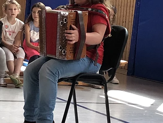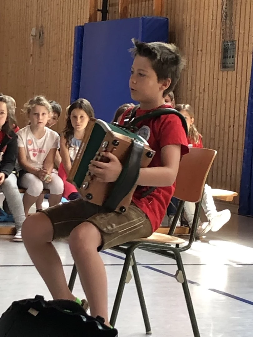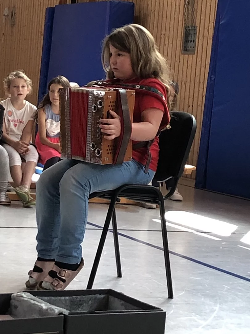 Das bekannte Lied „Vielen Dank für die Blumen“ hatte die 3. Klasse eingeübt. Nun folgte der erste Solobeitrag von Sara Vetter aus der 3. Klasse, die mit dem Akkordeon den „Veigerlwalzer“ vorspielte.