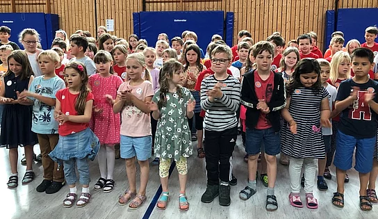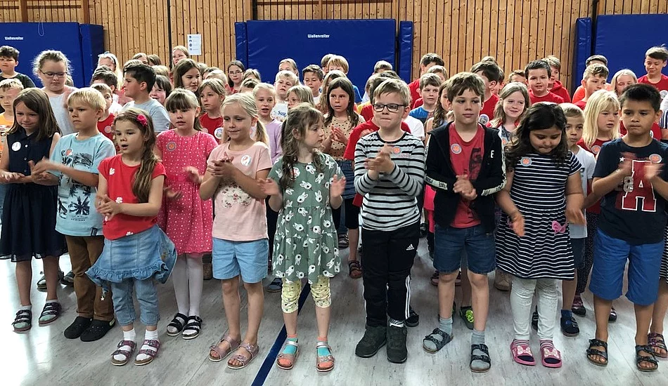 Das Motto „#Mach Musik“ stand im Mittelpunkt und jede Klasse hatte einen Beitrag einstudiert. Zum Musiktag waren sehr viele Eltern und Großeltern in die Turnhalle gekommen, um diesem kleinen Konzert beizuwohnen.
