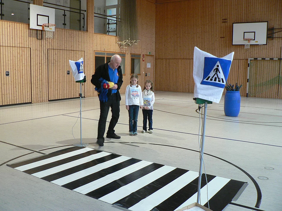 Aufgepasst mit ADACUS Eine interessante Schulstunde durfte die erste Klasse der Grafen-von-Schaunberg Schule erleben. Der Rabe ADACUS vermittelte den Schülern auf spielerische Weise das richtige Überqueren der Straße am Zebrastreifen oder an einer Ampel. Herr Max Rutzinger, ehrenamtlicher Mitarbeiter des ADAC, besprach mit den Kindern zunächst anhand von Bildern gefährliche Situationen am Bahnübergang und an Kreuzungen. Dann wurde gemeinsam mit der Handpuppe ADACU ein Lied gesungen. Natürlich durften auch praktische Übungen nicht fehlen. Eifrig marschierten die Schülerinnen und Schüler, entweder als Fußgänger oder als Fahrzeug verkleidet, über einen extra in der Turnhalle aufgebauten Kreuzungsbereich. Herr Rutzinger achtete besonders darauf, dass die Kinder am Zebrastreifen immer kurz stehen bleiben und einen kurzen Blickkontakt zu den Autofahrern aufnehmen. Am Ende durften die Schülerinnen und Schüler noch eine Urkunde und einen Aufkleber mit nach Hause nehmen. Allen hat das Verkehrssicherheitsprogramm des ADAC sehr gut gefallen.