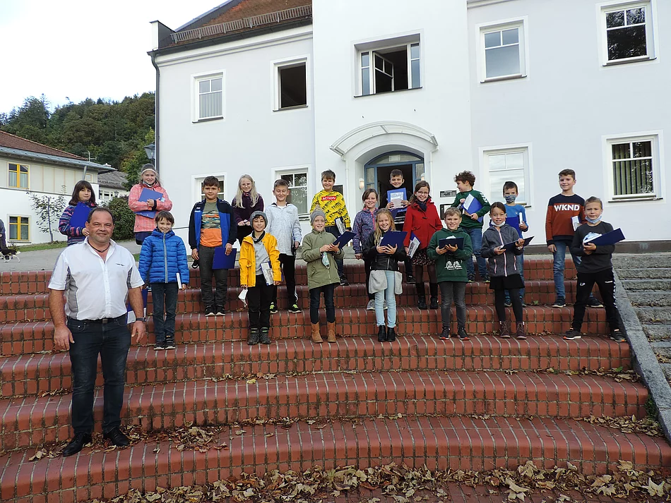 Die 4. Klasse befasste sich im HSU-Unterricht mit dem Thema "Gemeinde". Zum Abschluss durften die Kinder Herrn Bürgermeister Schusterbauer im Rathaus besuchen. Viele Fragen hatten sich die Kinder notiert, die er geduldig beantwortete. Alle freuten sich, dass sie im großen Sitzungssaal Platz nehmen durften. Große Anerkennung fanden die Bilder mit den Entwürfen des neuen Rathauses, die die Kinder betrachten konnten. Auf die Frage, warum ein neues Rathaus gebaut werden muss, machte Herr Schusterbauer den Vorschlag, die Kellerräume anzusehen. Hier wurde die schlechte Bausubstanz sehr deutlich. Nachdem in alle Räume ein Blick geworfen wurde, erhielten die Kinder noch einen schönen Schlüsselanhänger mit dem Gemeindewappen und ein interessantes Buch über die Geschichte Julbachs. Damit rundete diese erlebnisreiche Schulstunde das Thema "Gemeinde" ab.