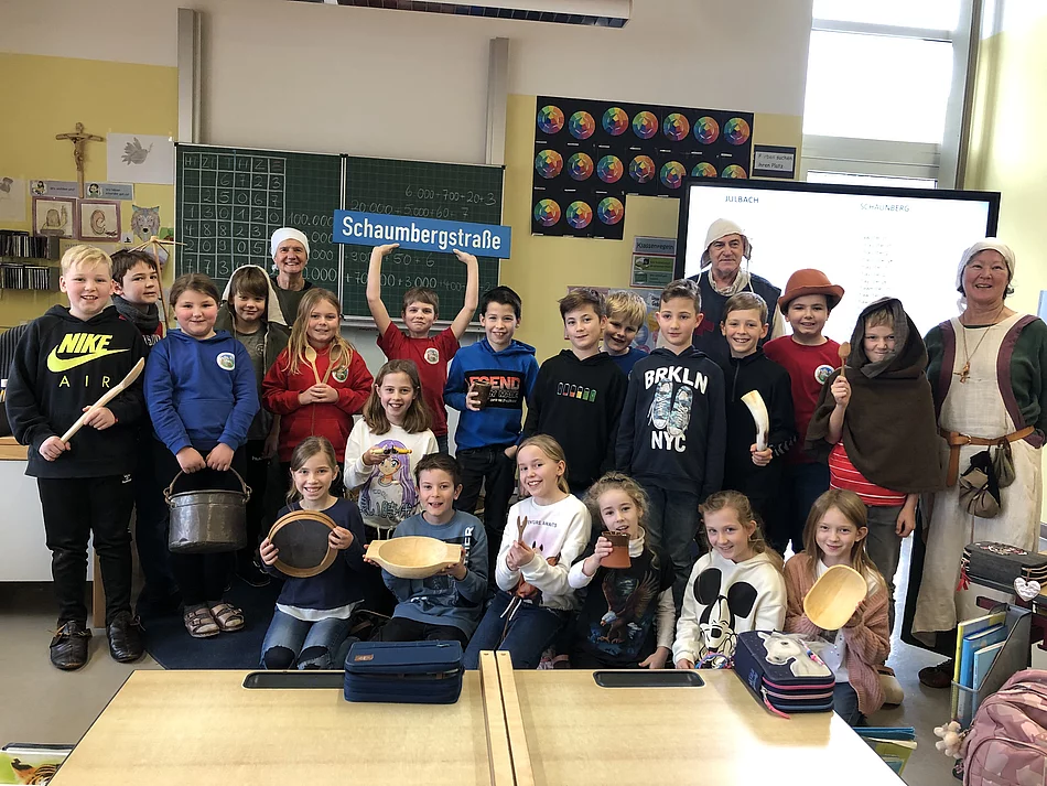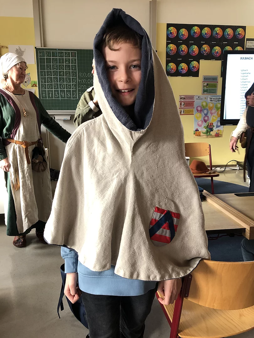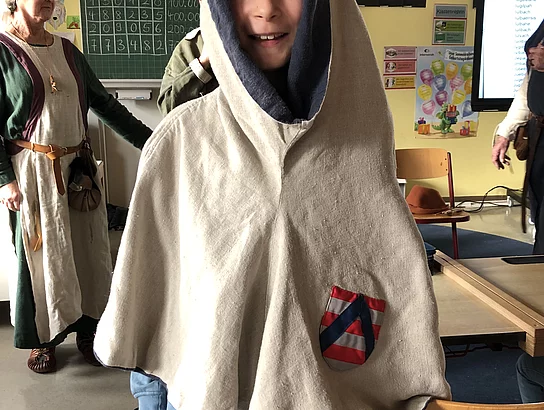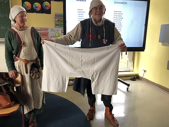 Zum Abschluss des HSU-Themas"Geschichte" erhielt die 4. Klasse Besuch einer "Abordnung" der Burgfreunde Julbach e.V.. Gitti und Wolf-Dieter Hergeth sowie Anita Jäger nahmen sich zwei Unterrichtsstunden Zeit, um den Kindern interessante Einblicke in das Leben im Mittelalter zu gewähren. Sehr viele Anschauungsgegenstände hatten sie mitgenommen. Gewandet in der mittelalterlichen Kleidung konnte man als erstes die Mode der damaligen Zeit bewundern und zum Teil selbst anprobieren. Gegenstände aus der Küche und Spielzeug wurde genau betrachtet und ausprobiert. Herr Hergeth, der den Kindern auch schon die Fundgegenstände im alten Feuerwehrhaus gezeigt hatte, wusste viel Wissenswertes aus dieser alten Zeit zu berichten und erweckte damit viel Erstaunen bei den Schülerinnen und Schülern der heutigen Zeit.