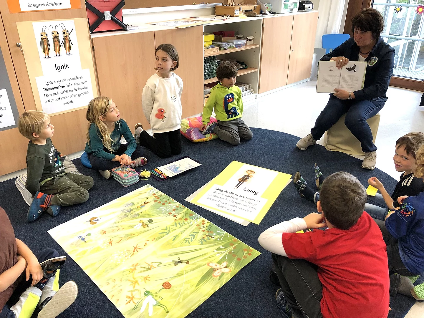 Sonja Schachtner, Klassenlehrerin der 1. Klasse, las aus dem Buch „Willkommen im Hotel zur grünen Wiese“, in dem es viel Aufregung um den (bienen- ) königlichen Besuch gab.