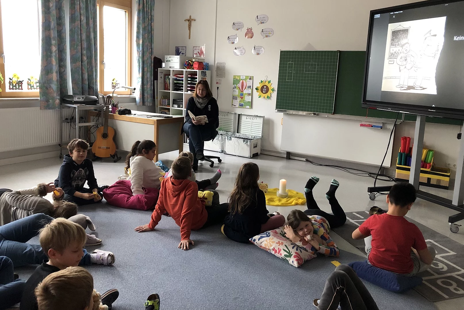 Am Freitag nach der Pause war es dann soweit und die Lesesäle öffneten ihre Türen. Mit Kuscheltier und Kissen machten es sich die Kinder bequem, um den Geschichten zu lauschen. Nach jeweils 45 Minuten wurde gewechselt. Die Leseangebote stammten zum größten Teil aus der Vorschlagsliste der Stiftung Lesen zum diesjährigen Motto.