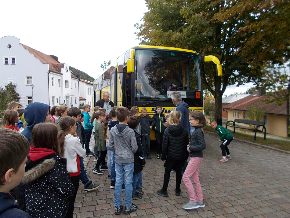 Zu Beginn des neuen Schuljahres wurden die Schulkinder von der Firma Schemmer im richtigen Verhalten beim Fahren mit dem Bus unterwiesen. Herr Rupert Schemmer und sein Kollege nahmen sich Zeit, um den Kindern das richtige, zeitsparende Anstellen beim Einsteigen zu zeigen. Dann konnten die Kinder eindrucksvoll erleben, was passiert, wenn der Busfahrer plötzlich abrupt bremsen muss. Deshalb sollen die Kinder immer ordentlich auf dem Platz sitzen bleiben. Der Film "Hallo Busfahrer" verdeutlichte zusätzlich das Gesagte. Eindringlich gewarnt wurde vor dem Aufenthalt im "Toten Winkel". Die Kinder durften z.T. selbst auf dem Fahrersitz Platz nehmen und sich davon überzeugen, dass die Kinder sich hier selbst in große Gefahr begeben. Selbstverständlich gehört auch ein höfliches Benehmen zum Aufenthalt im Bus. Schulleitung, Lehrerinnen und die Firma Schemmer hoffen, dass es im neuen Schuljahr keine Probleme beim Transport der Kinder auf dem Schulweg geben wird.