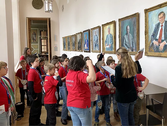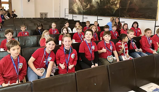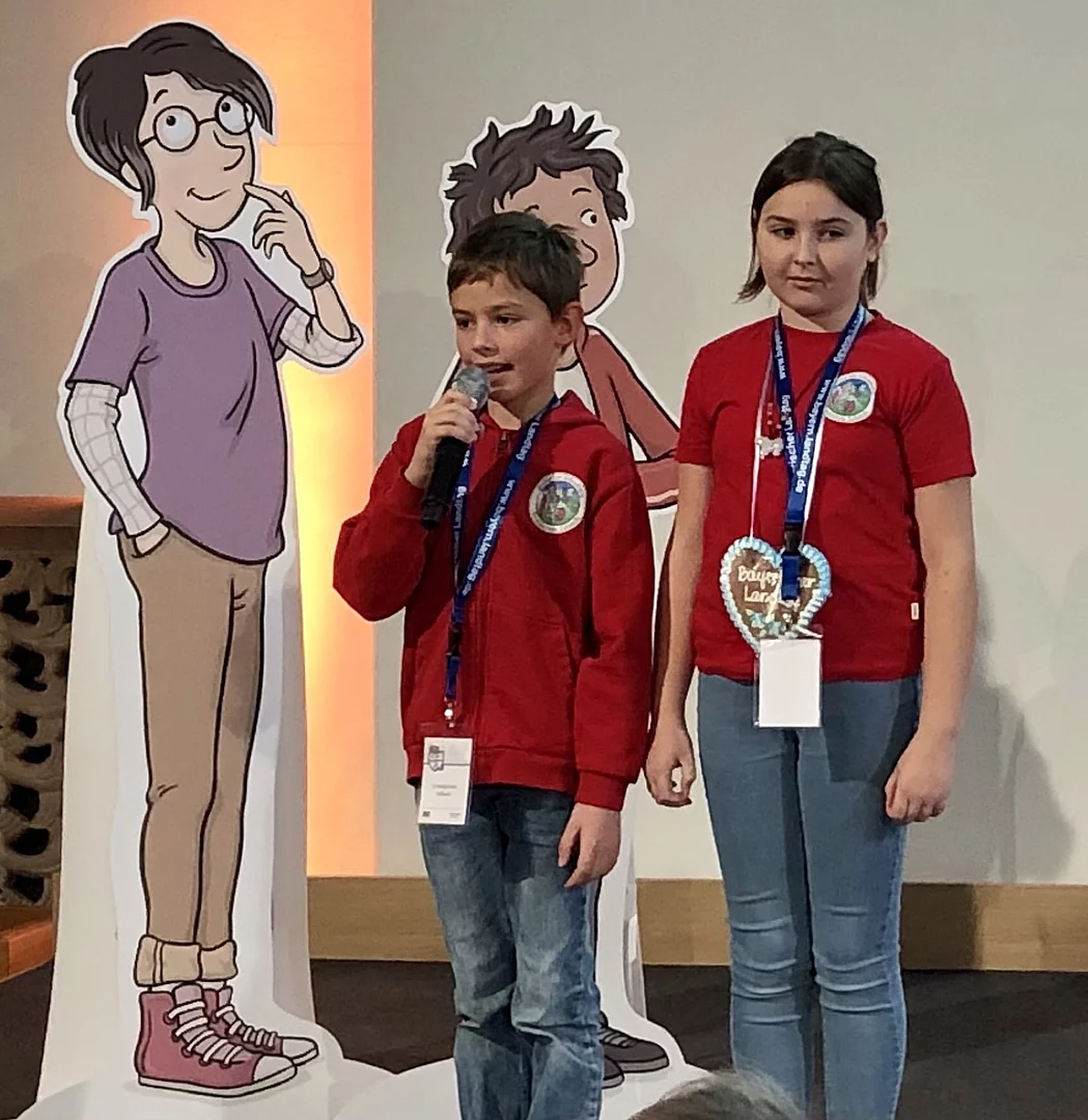 Im Anschluss fand im Senatssaal die Begrüßung statt. Landtagspräsidentin Ilse Aigner begrüßte Mitglieder des Präsidiums, die Autorin Anja Janotta, den Illustrator Stefan Leuchtenberg und Christian Graef vom Oetinger Verlag. Danach wurden die Schulen vorgestellt. Aufgeregt kamen pro Schule zwei Kinder auf die Bühne, um sich vorzustellen und zu erzählen, was ihnen an den Isar-Detektiven besonders gefällt. Für die Grundschule Julbach durften dies Katharina Nußbaumer und Ben Korneder übernehmen.