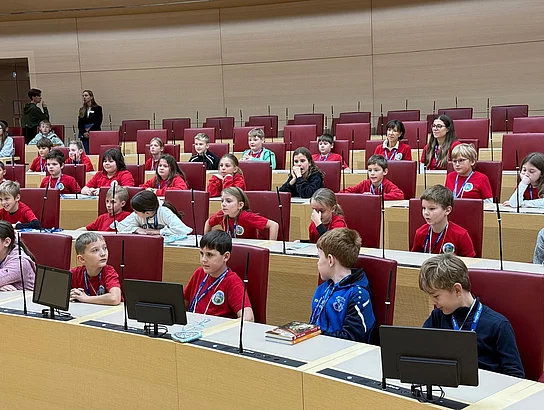 Anschließend wurde in den Plenarsaal gewechselt zur Vorleseaktion. Alle Kinder durften auf den Stühlen der Abgeordneten Platz nehmen. Passend zum Raum las die Autorin aus Band 1 eine Szene im Plenarsaal vor. Dort beteiligten sich alle eifrig an der Gesprächs- und Fragerunde mit der Landtagspräsidentin, der Autorin und dem Illustrator , durfte man doch auch ganz professionell sein eigenes Mikrophon einschalten.