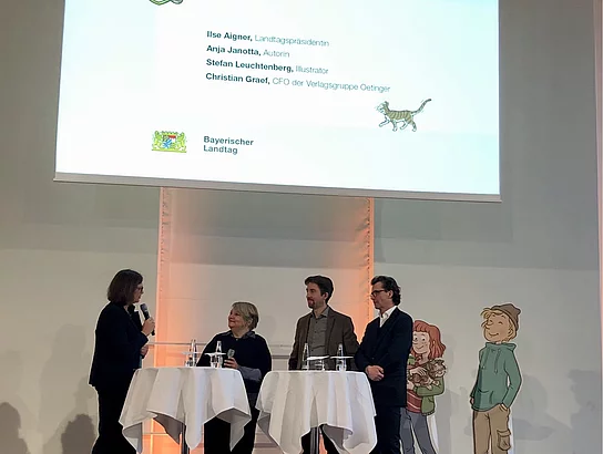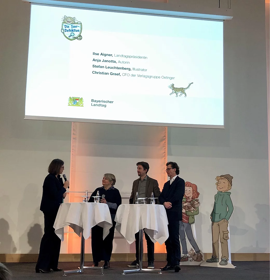 Sehr interessant gestaltete sich die anschließende Gesprächsrunde mit der Landtagspräsidentin, der Autorin, dem Illustrator und dem Verleger. Die Vorfreude auf den neuen Fall der Isardetektive war groß und so war die Autorin gleich für eine Leseprobe aus dem neuen Band „Verfolgungsjagd über der Isar“ bereit. Schließlich war es Zeit für die gemeinsamen Gruppenfotos.