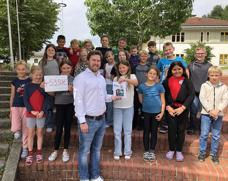 Am Theaterabend der Grundschule bewirtschaftete die 4. Klasse eine Kindercocktailbar, um Geld für das langjährige Regenwaldprojekt zu sammeln. Den ganzen Abend bedienten sie die Gäste und schenkten fleißig "Theatercocktail", "Bananenshake" und "Vergiftungscocktail" aus, bis der letzte Tropfen weg war. Da die Getränke zu Taschengeldpreisen angeboten wurden, lief das Geschäft so gut, dass am Ende 435,50 € in der Kasse waren. Gleich wurde Herr Florian Holzner eingeladen, der stets als Kontaktmann fungiert, um die Spende dem Naturpark Orquigonia in Guatemala zukommen zu lassen. Die "Schauspieler" und "Barbetreiber" freuten sich bei der Übergabe, dass sie mit ihrem Einsatz so erfolgreich waren.