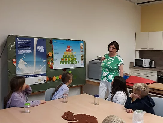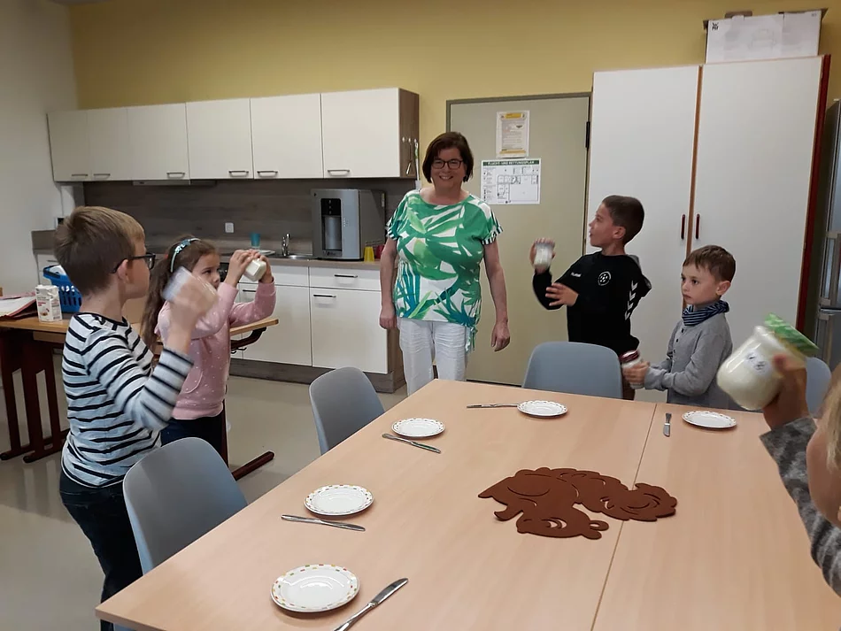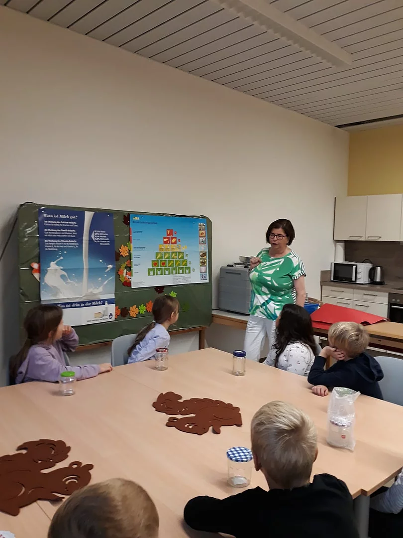 Frau Haderer erklärte den Kindern, dass Milch und alle Milchprodukte sehr gesund sind. Milch enthält neben hochwertigem Eiweiß, bekömmlichem Milchfett und Milchzucker auch wichtige Mineralstoffe und Vitamine. Milch und Milchprodukte sind bedeutende Lieferanten für Kalzium und Vitamin B12. Besonders Kalzium ist sehr wichtig für den Aufbau von Knochen und Zähnen.