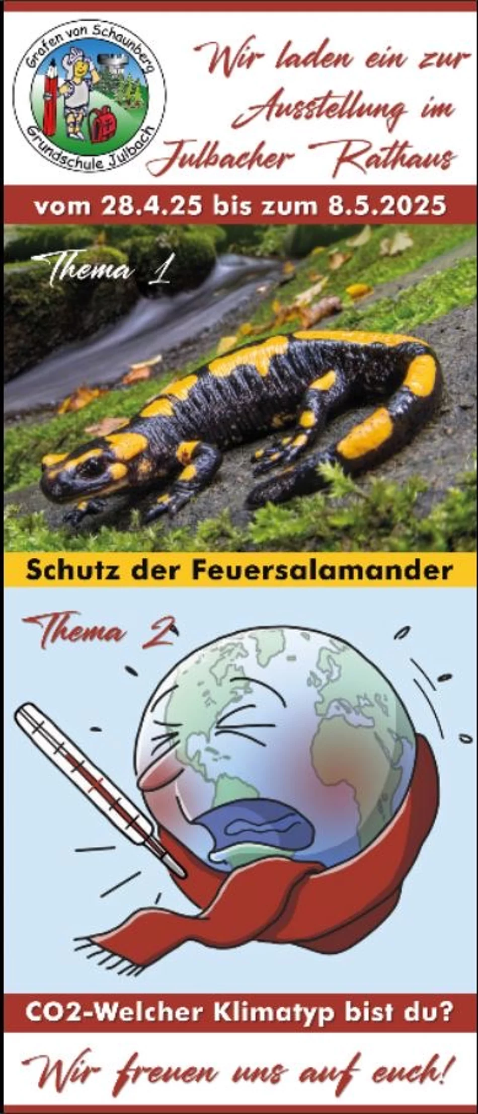 Ab heute kann die Ausstellung "Schutz der Feuersalamander" und "CO2-welcher Klimatyp bist du?" im Rathaus Julbach besucht werden. Am Vormittag fand die offizielle Eröffnung statt. Die Schulkinder freuen sich über viele Besucher, die bei den Mitmachaktionen ihre Arbeit unterstützen.