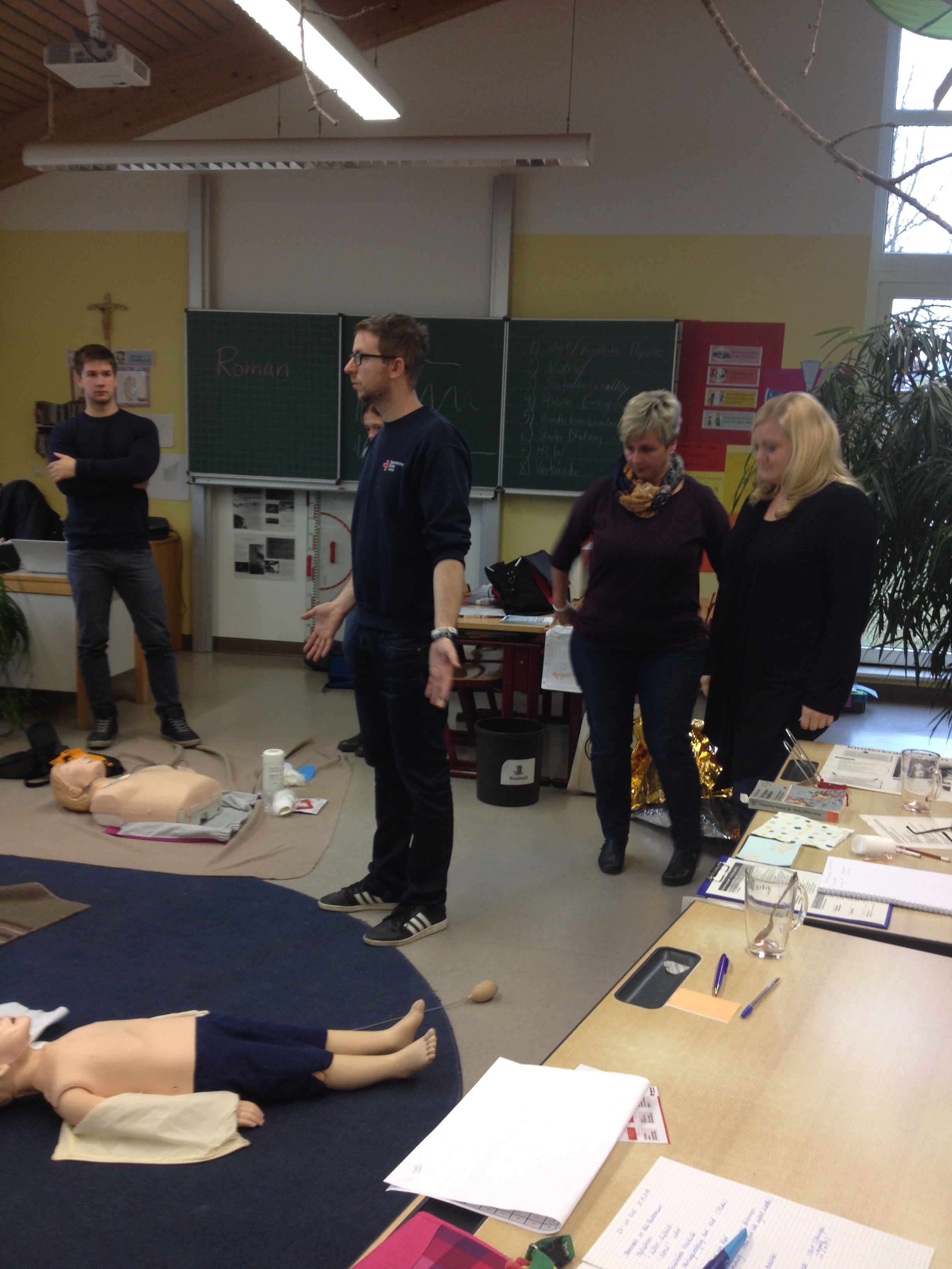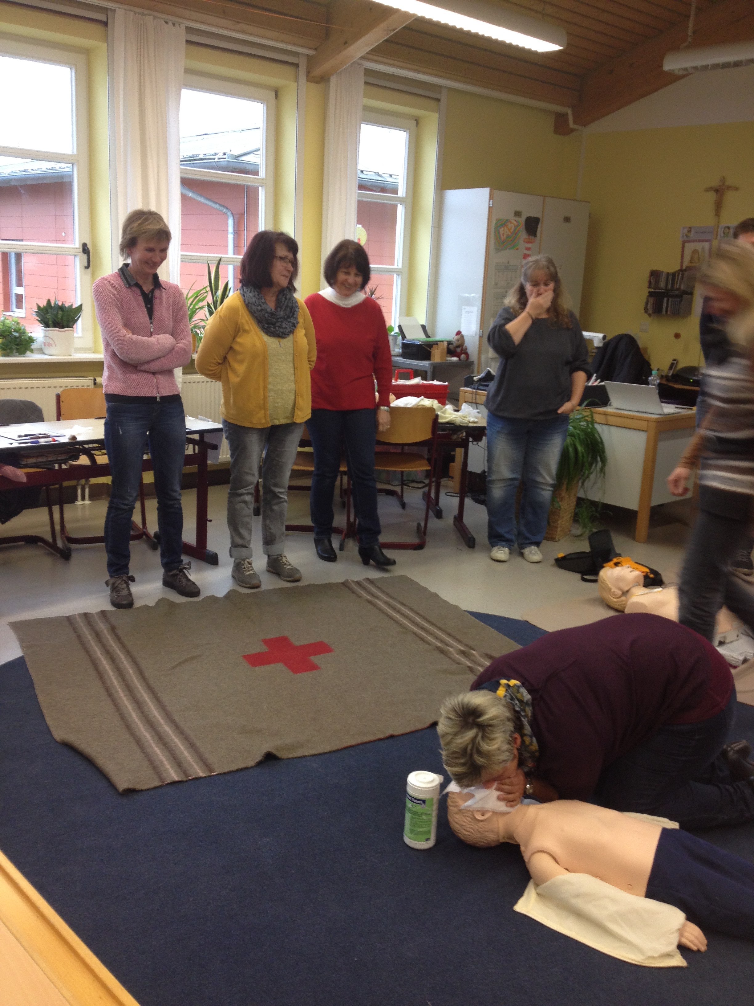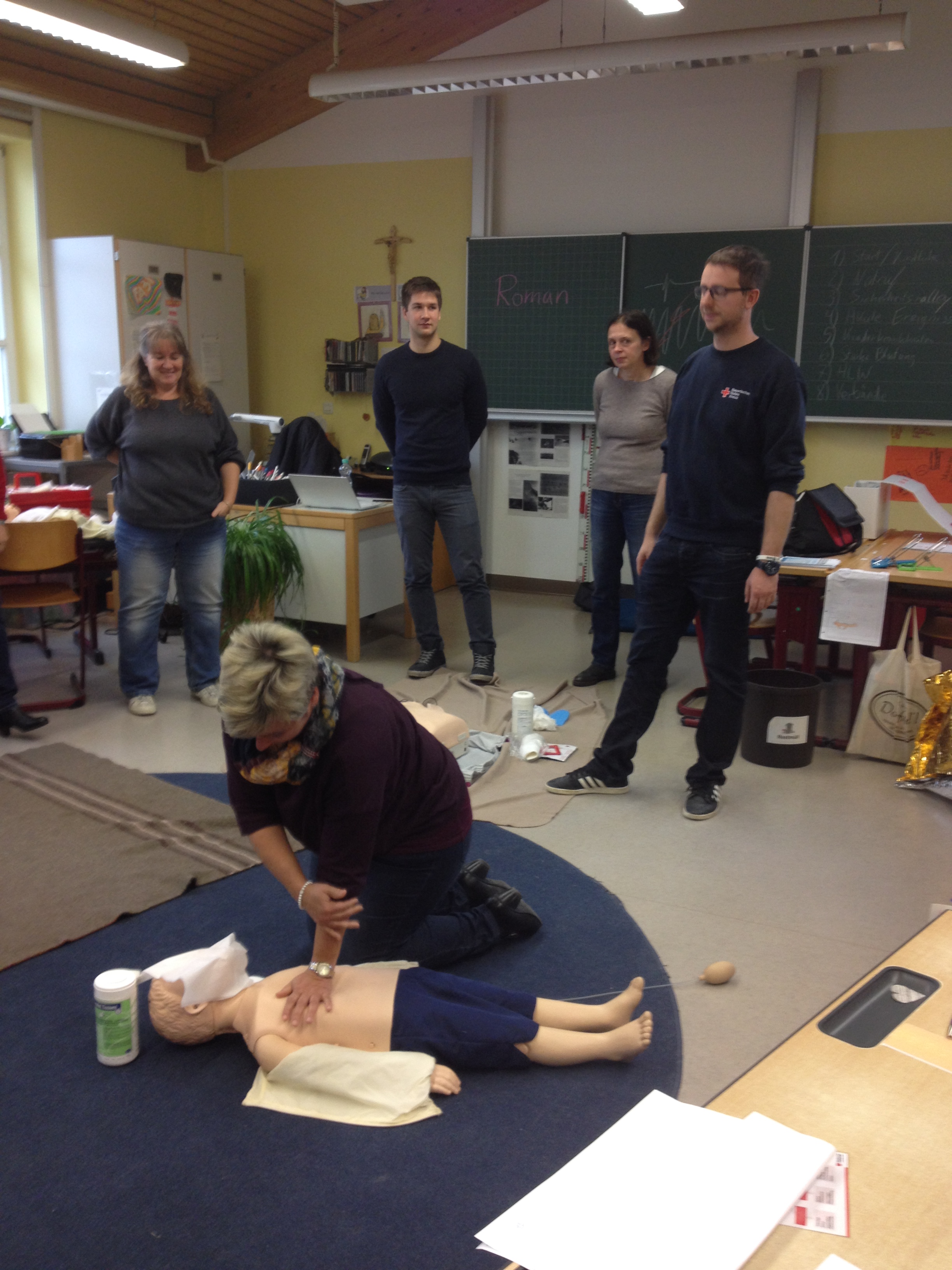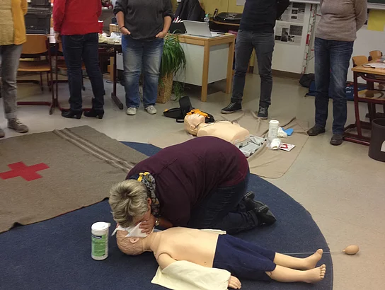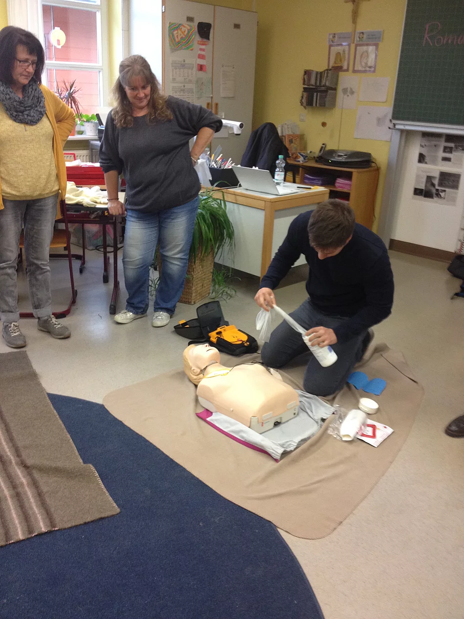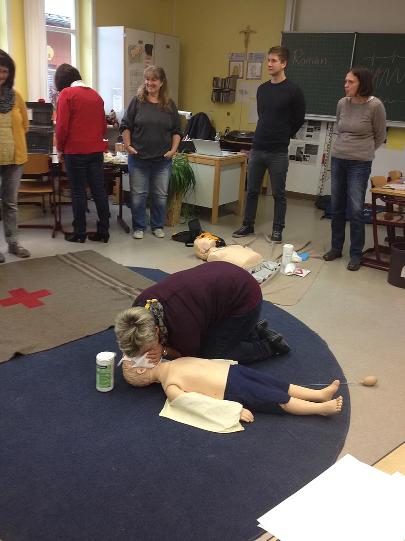 Der schulfreie Buß-und Bettag wurde vom Kollegium der Grundschule und dem Team der OGTS zur Durchführung eines Erste Hilfe Kurses am Kind genutzt. Als gute gesunde Schule hatte man diese Aktion für alle Mitarbeiter bereits schon länger geplant. Als Kursleiter konnte Roman Seibold gewonnen werden, der als "Helfer vor Ort" im Einsatz ist. Sehr engagiert und anschaulich vermittelte er sowohl Grundlagenwissen als auch praktische Hilfe und Maßnahmen im Notfall. Bei der Sicherheitsralley durch das Schulhaus wurden aktuell alle Notfalltüren, Verbandskästen und Alarm- sowie Notrufeinrichtungen begutachtet. Resultierend wurde festgestellt, dass die Grundschule einen großen Sicherheitsstandard aufweist. Woran erkenne ich auftretende Kinderkrankheiten? Welches sind die besonderen Bedürfnisse eines Kindes bei einem Notfall? Wie helfe ich bei einem Unfall, bei Hitzschlag, Verbrennungen oder Krämpfen? Diese und noch mehr Fragen, die auch im Schulalltag immer wieder auftauchen, wurden in der Runde ausführlich erörtert. Praktisch durchgeführt und geübt wurden die Wiederbelebungsmaßnahmen an den Puppen. Herr Seibold brachte auch eine Kinder- und Babypuppe mit, deren Einsatz zum Teil etwas Beklemmung auslöste, aber doch den Teilnehmerinnen die Scheu nahm, im Notfall auch beherzt einzugreifen. Die Funktionsweise eines Defibrillators war den meisten Kursteilnehmern fremd. Deshalb war man dankbar, auch ein solches Modell ausprobieren zu können. Anschließend wurden Verbände angelegt, wobei alle Teilnehmerinnen die praktischen Tipps des Kursleiters anwenden konnten. Am Ende des Tages waren sich alle einig, dass man nicht nur alte Kenntnisse auffrischen konnte, sondern viele interessante Informationen und praktische Maßnahmen, die im Notfall anzuwenden sind, dazugelernt hatte.