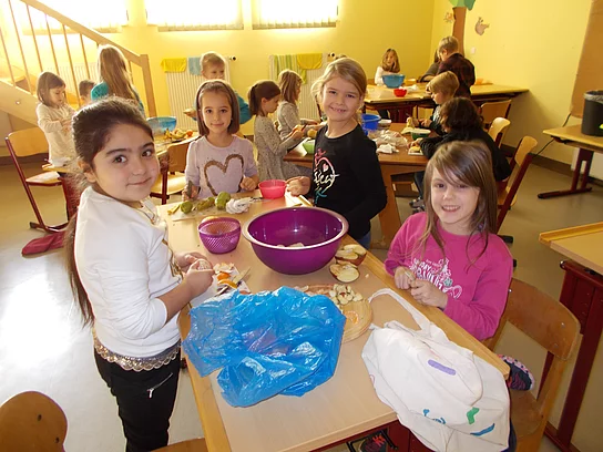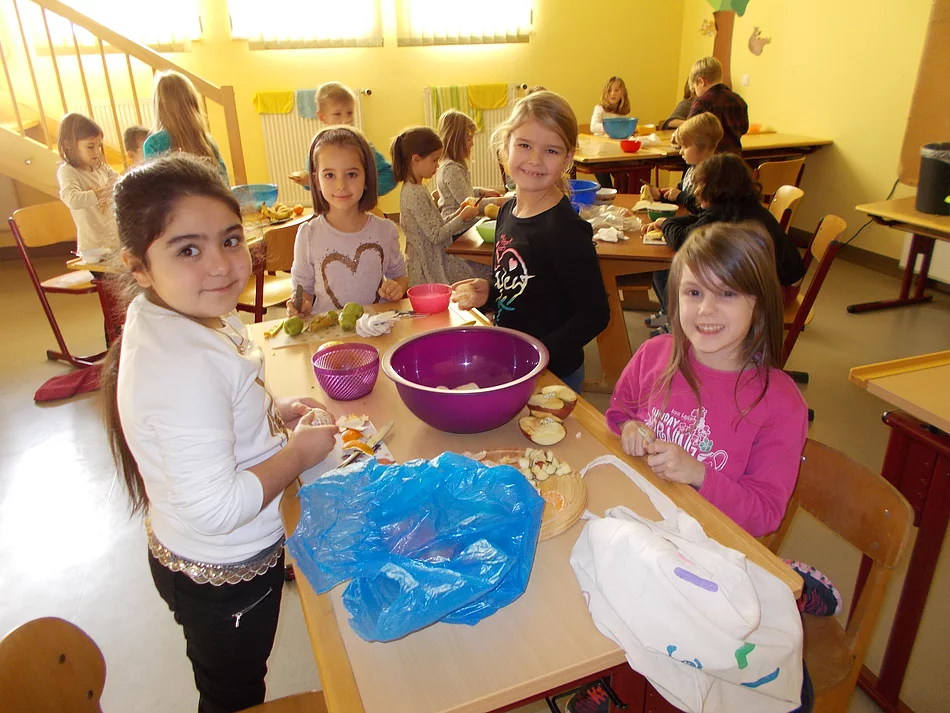 Obstsalat mit viel heimischen Obstsorten selbst gemacht! Im Heimat– und Sachunterricht der zweiten Klasse steht im Moment Obst im Mittelpunkt. Die Kinder machten sich bereits viele Gedanken darüber, wie manche Obstsorten zu uns nach Deutschland kommen. In Supermärkten fanden sie heraus, aus welchen Ländern Orangen, Kiwis, Ananas usw. stammen. Anschließend wurde nachgeforscht, welche Entfernungen die einzelnen Obstsorten bereits hinter sich hatten. Die Ergebnisse hielten die Schülerinnen und Schüler auf Plakaten fest. Die Kinder kamen zu dem Schluss, dass man mehr heimische Obstsorten essen sollte und die anderen nur ab und zu, damit unsere Umwelt durch die Transportmittel nicht so sehr geschädigt wird. Heimisches Obst, wie Erdbeeren und Himbeeren sind dann besonders lecker, wenn sie frisch bei uns geerntet werden können. Mit diesem Wissen ausgestattet plante die zweite Klasse selbst einen Obstsalat herzustellen. In Gruppen wurde geplant, welche Früchte hineinkommen sollten, natürlich haben nicht alle den gleichen Geschmack! Am Freitag war es dann so weit. Die Kinder schälten, wuschen und schnitten sehr eifrig. Man war sich einig, dass der Salat mit Honig und nicht mit Zucker gesüßt werden kann. Zuletzt aßen die Kinder ihren selbst zubereiteten Obstsalat! Alle fanden ihn sehr lecker!