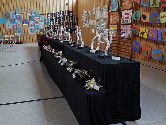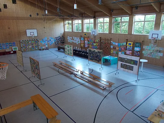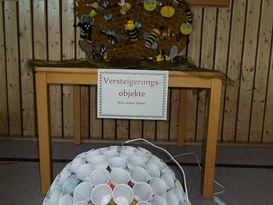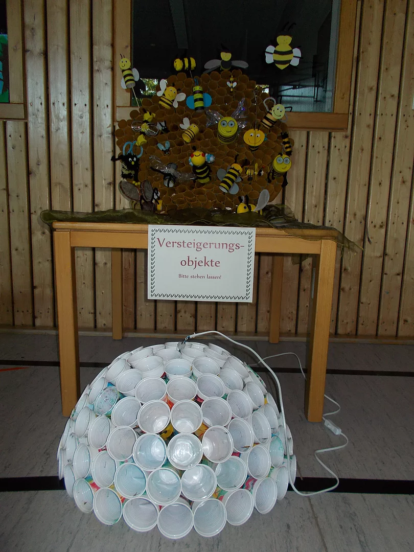 Die Turnhalle in ein Museum umzuwandeln ist dem Elternbeirat mithilfe der Bilder und Kunstwerke aller Kinder gelungen. Mit nahezu 1000 Exponaten wurde eine Ausstellung geschaffen, die den Zuschauern einen Eindruck vermitteln konnte, wie kreativ die Schüler im Fach Kunst arbeiten. Die Besucher durften sich auch Bilder gegen eine Spende mit nach Hause nehmen. Insgesamt acht Gemeinschaftsarbeiten der Klassen 1-4 wurden dann noch sehr gewinnbringend versteigert. Der Erlös ging heuer zu gleichen Teilen an das Hilfsprojekt "Suibamoond" vom Sänger Alfons Hasenknopf aus Altötting und an Florian Holzner, der Kontaktperson für unser Regenwaldprojekt. Eröffnet wurde die Vernissage mit einem kleinen Schülerkonzert. Anschließend erläuterte Herr Hasenknopf die Arbeit seines Hilfsprojektes. Danach konnten alle Anwesenden bei Fingerfood und Getränken vom Elternbeirat durch die Ausstellung bummeln und vor den Kunstwerken verweilen. Im Foyer musste man sich durch eine "Plastikflut" seinen Weg bahnen. So wurde jedem Einzelnen bewusst, mit wieviel Müll man sich umgibt und an die Plastikfastenaktion im Frühjahr erinnert. Die Schulfamilie war sich einig, dass es ein sehr unterhaltsamer Abend war und das Sammelergebnis kann sich sehen lassen: nach Leeren der Spendentöpfe können nun je 500€ Spende überwiesen werden. Die Schulleitung und der Elternbeirat danken den vielen interessierten Besuchern, die unser soziales Projekt so tatkräftig unterstützt haben.