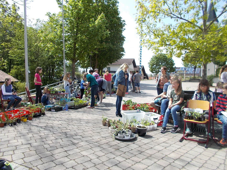 Großes Glück mit dem Wetter hatten alle Verantwortlichen bei beiden Veranstaltungen. So wurde nach fünf Jahren wieder ein prächtiger Maibaum aufgestellt, der zum ersten Mal auch mit einem Taferl der Grundschule geschmückt ist. Sehr viele Leute nahmen an diesem schönen Fest teil. Nachdem der Maibaum aufgestellt war, gestalteten der Kindergarten und die Grundschule einen Teil des Unterhaltungsprogramms. Ganz passend zum strahlenden Sonnenschein sangen die anwesenden Grundschüler das Lied "Aber heit" und unterm Maibaum zeigte die 4. Klasse in Tracht einen Tanz zum Lied "Wenn der Maibaum wieder am Dorfplatz steht". Sie wurden mit viel Applaus für ihre Darbietungen belohnt. Am nächsten Tag fand zum zweiten Mal der beliebte Pflanzenflohmarkt der Grundschule statt. Nach Unterrichtsende boten die Kinder selbst gezogene Pflänzchen, Ableger, Jungpflanzen und Stecklinge zu Taschengeldpreisen an. Viele ausgefallene Salat-, Gemüse-, Kräuter- und Blumensorten konnte man erstehen. Bald herrschte reges Treiben und viele Pflänzchen wechselten den Besitzer. Eingeladen wurde auch Frau Sikora vom Eine Welt Laden in Pfarrkirchen. Diese hatte ebenfalls ein breites Angebot an fair gehandelten Waren dabei, die von den Besuchern gerne gekauft wurden. Der Elternbeirat sorgte mit gesunden Broten und Getränken für eine gute Mittagsbrotzeit und stillte damit den Hunger der fleißigen "Marktleute".