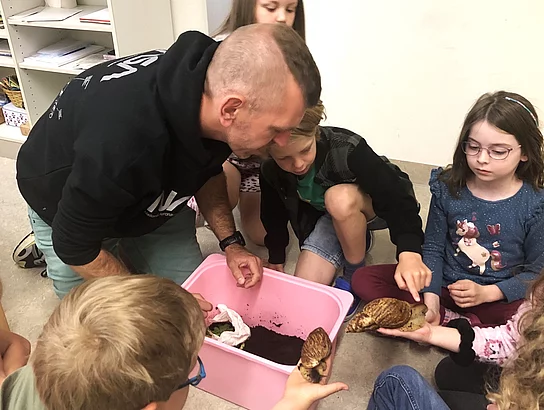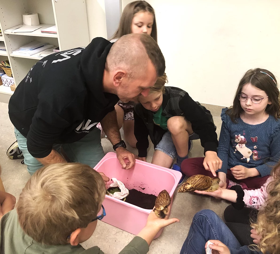 Herbert Forstmeier brachte Schnecken mit. Die bekannten Arten aus der Nähe zu beobachten war schon interessant, doch die als Haustiere gehaltenen afrikanischen Achatschnecken waren faszinierend. Dabei erfuhren die Kinder sehr interessante Kenntnisse über die Haltung exotischer Haustiere.