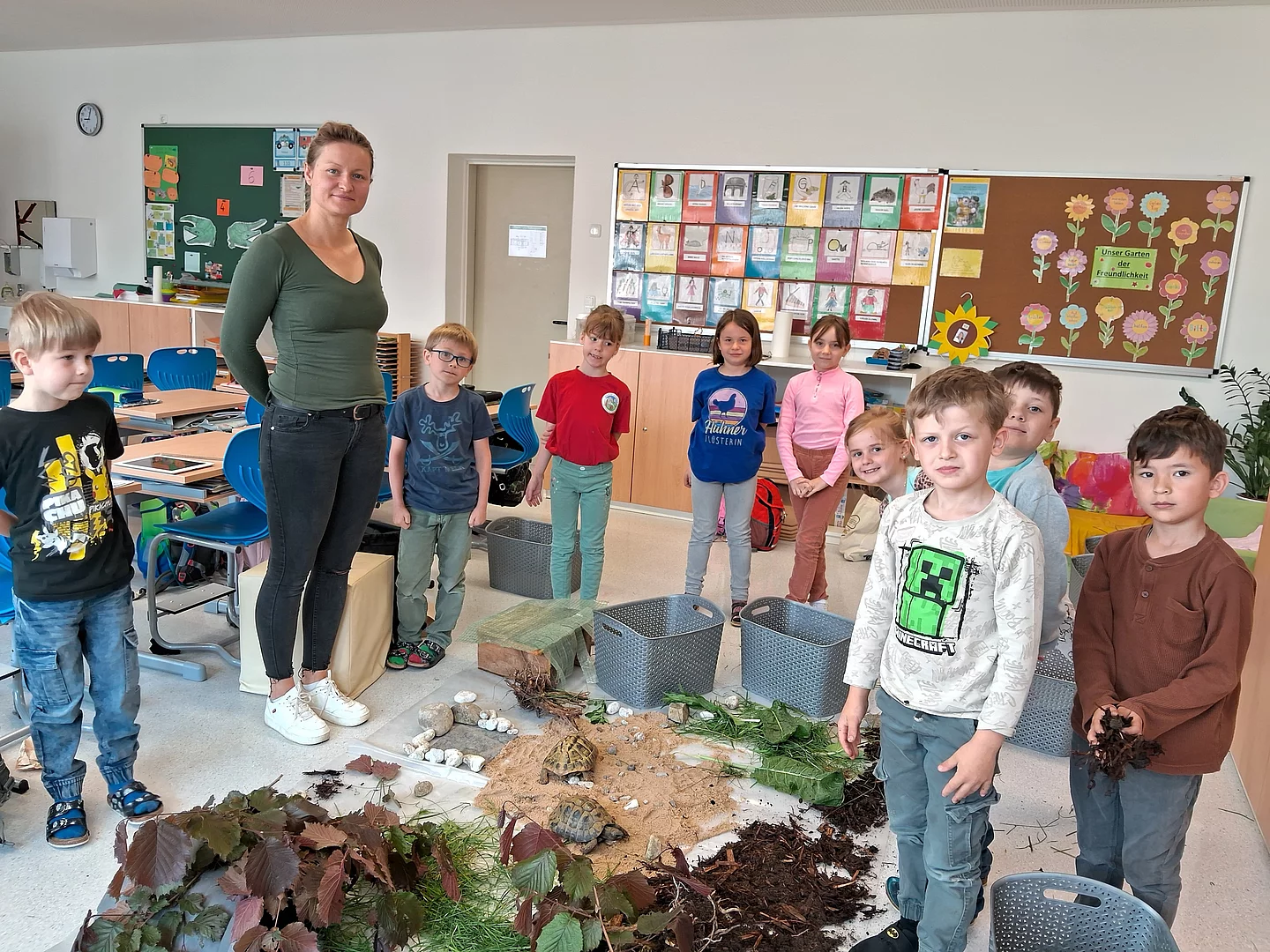 Sehr beliebt waren die Workshops mit Tieren. Immer wieder begegnen den Schülern auf Verpackungen Warnhinweise zum Umweltschutz, auf denen Schildkröten abgebildet sind. Diese Tiere aus der Nähe genauer kennen zu lernen, war Inhalt bei Karoline Lenk, die von Klassenleiterin Sonja Schachtner begleitet wurde.