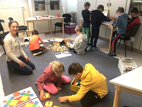 Mathematik von ihrer schönsten Seite erfuhren die Kinder bei Eva Maria Haunreiter, die in ihrem Workshop „Geometrie“ Gelegenheit bot, alle Spiel- und Arbeitsmaterialien zur Geometrie zu verbauen. Geometrische Körper und symmetrische Kunstwerke wurden in gemischten Gruppen zusammengesetzt.