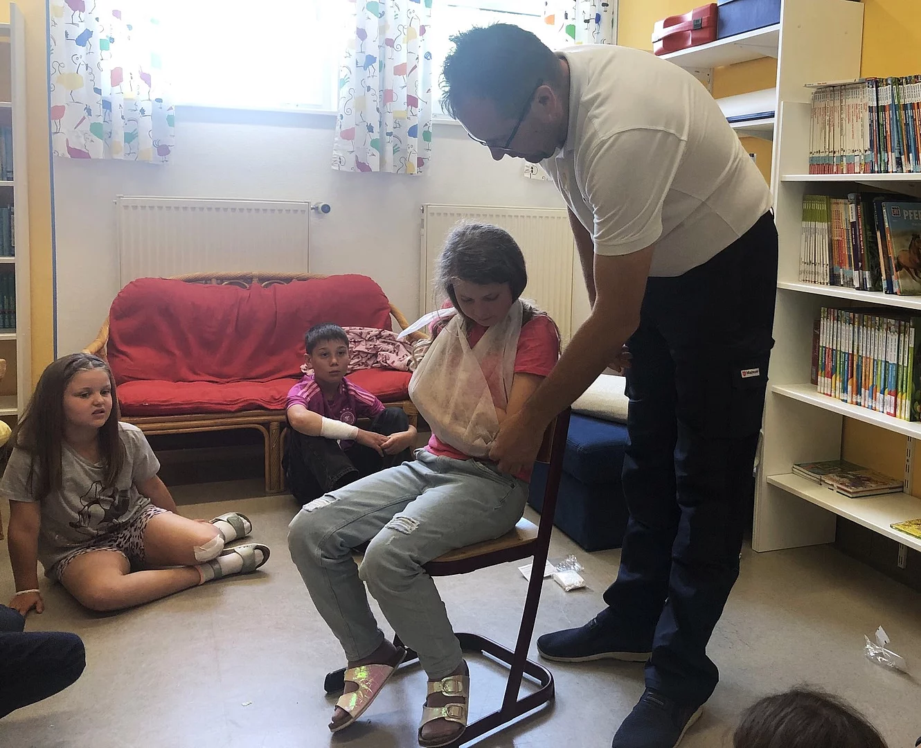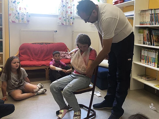 Als Fachmann erwies sich Schülervater Roland Bucher vom Malteser Hilfsdienst. Dass auch Kinder schon Erste Hilfe leisten können, zeigte er anhand praktischer Beispiele. Auch erprobte Techniken zur Rettung von Verletzten wurden erfahrbar gemacht.
