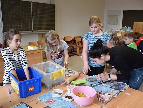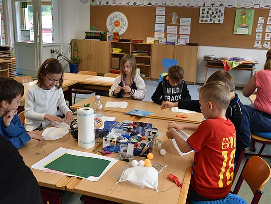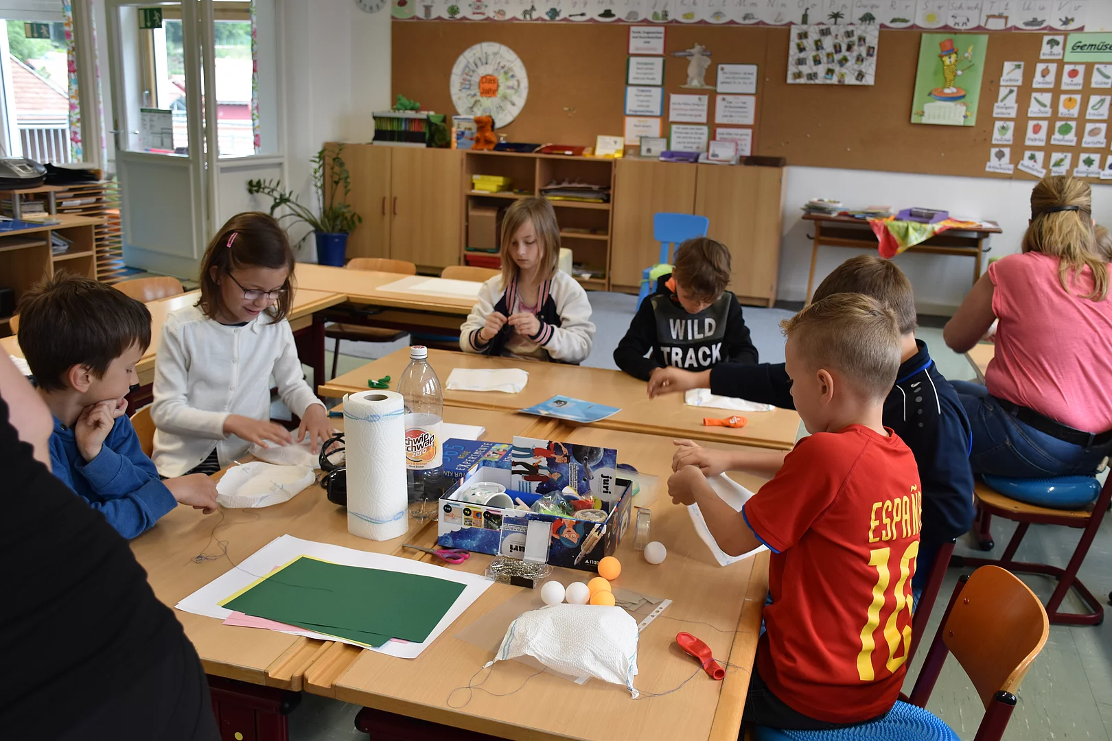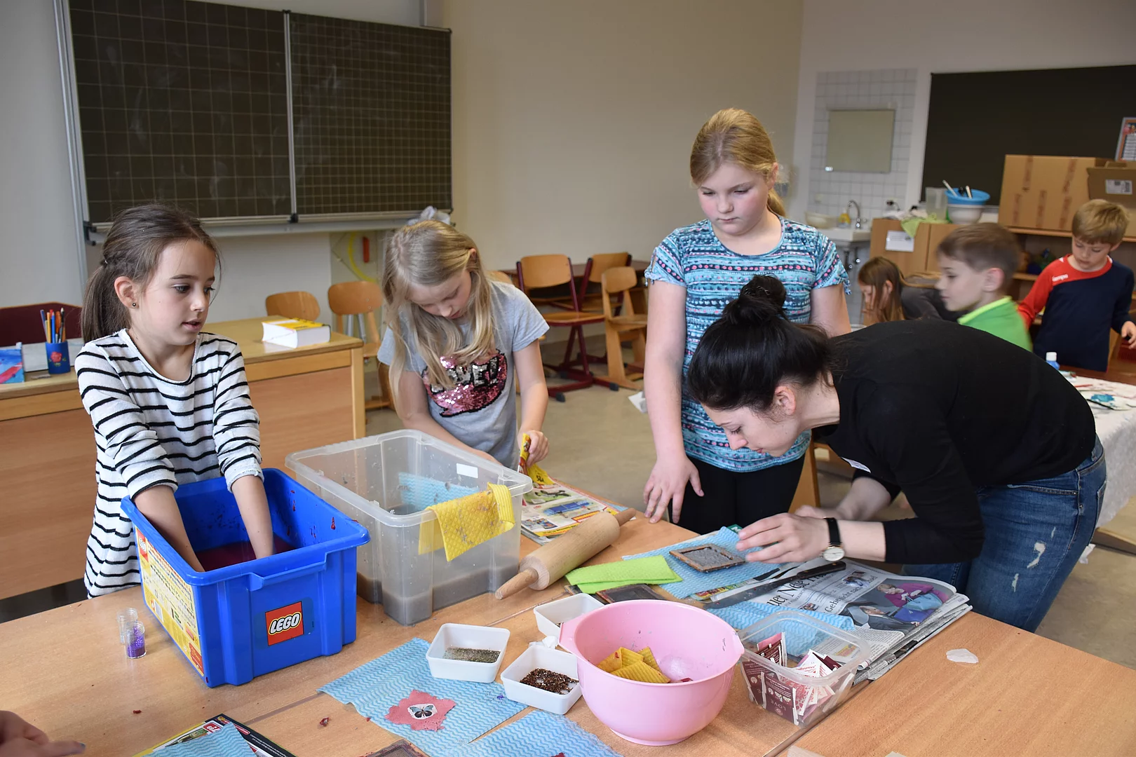 Experimentelle schul- und jahrgangsübergreifende Arbeit am naturwissenschaftlichen Tag Dass sich die Grundschule als „offene“ Schule bezeichnet, konnte man am naturwissenschaftlichen Tag einmal mehr erleben. Traditionell am „Brückentag“ übernehmen die Eltern im Rahmen der Erziehungs- und Bildungspartnerschaft am Vormittag das Ruder und bringen sich mit ihrem Können und Wissen in die Bildung der Kinder ein. Zehn verschiedene Workshops wurden den Kindern angeboten, aus denen zwei gewählt werden konnten. Darunter waren altbewährte und auch ganz neue Themen, die bei den Kindern auf großes Interesse stießen. Ein Schulvormittag, der über die normale Wissensvermittlung hinausgeht und den Kindern Zeit und Gelegenheit bietet, seinen Interessen gezielt nachzugehen. Die Organisation lag in den Händen von Elternbeiratsvorsitzendem Stefan Striegl, der erfolgreich viele engagierte Eltern zur Mitarbeit bewegen konnte. Ein beliebter Workshop war „Feuer“. Kerstin Hasreiter und Bettina Jetzlsperger erweiterten die Schülerkenntnisse aus dem Unterricht mithilfe von Versuchen aus der Experimentierkiste. Ein weiteres HSU-Thema „Luft“ wurde von Simone Farkas und Daniela Altmann aufbereitet. Lustige Versuche verdeutlichten die Naturgewalt Luft und sogar ein Raketen konnten ohne künstlichen Antriebgebastelt und gestartet werden. Mathematik von ihrer schönsten Seite erfuhren die Kinder bei Matthias Westner und Stefan Striegl, die in ihrem Workshop Gelegenheit boten, alle Spiel- und Arbeitsmaterialien zur Geometrie zu verbauen. Geometrische Körper und symmetrische Kunstwerke wurden in gemischten Gruppen zusammengesetzt. Zum ersten Mal wagten sich Michaela Hartinger und Stefanie Starzer an das Thema „Bionik“, speziell im Bereich Wasser heran. Erstaunliche Erkenntnisse gewannen die Kinder, als man geniale technische Erfindungen als Naturphänomene erklären und nachweisen konnte. Sehr beliebt waren die Zubereitung und das Backen von Brot und vollwertiger Pizza. Marina Saß, Johanna Kainz und Christina Fritz bereiteten mit den Kindern die Köstlichkeit zu, die sogleich verzehrt wurde. Mit Greifzangen, Handschuhen und Müllsäcken bewaffnet, machte man sich auf die Suche nach achtlos weggeworfenem Müll in der Schulumgebung. Elisabeth Schulz und Marina Hawly führten die Kinder beim Workshop „Rama dama“. Gemeinsam wurde noch ein anschauliches Plakat zur Müllvermeidung gebastelt. Recycling von Papier übernahmen Sladjana Pieringer und Vanja Fuchs. Aus einer Pampe von Altpapier entstanden beim Papier schöpfen unter der fachkundigen Anleitung wunderschöne Bilder, die mit kindlichen Motiven verziert wurden. Verblüffende Einsichten in die Konstruktion und den Bau von Brücken erhielten die Kinder beim „Brücken bauen“. Maria Unterhuber stand eine Brückenbaukiste zur Verfügung, mit deren Hilfe beeindruckende Varianten aufgestellt und erklärt werden konnten. Für den Bienenworkshop konnte der Imker Theo Vöth gewonnen werden. Mit viel Liebe brachte er den Kindern die Lebensweise der Bienen nahe. Auch eine echte Bienenwachskerze durfte jeder drehen und mit nach Hause nehmen. Die Künstlerin Veronika Zunner-Fadhli zeigte den Kindern wie man alte Plastiktüten in echte Designertäschchen verwandeln kann. Mit bestimmten Techniken gelang dies den Kindern sehr gut. Allen Beteiligten machte der außergewöhnliche Schulvormittag viel Freude. Die Schulleitung und das Lehrerkollegium erweisen allen Leiterinnen und Leitern eines Workshops ihre Anerkennung und freuten sich, mithelfen zu dürfen. Alle hoffen auf eine Fortsetzung im nächsten Jahr.