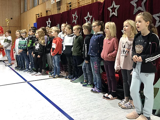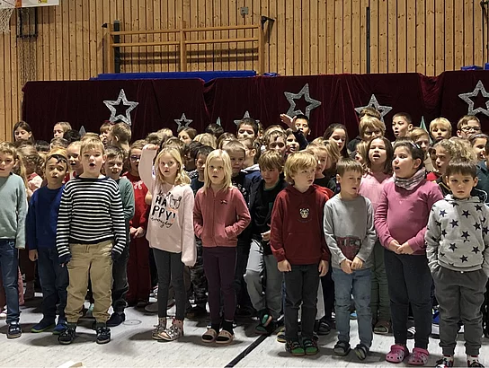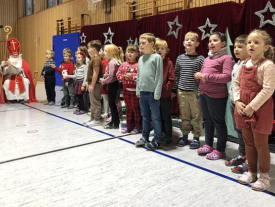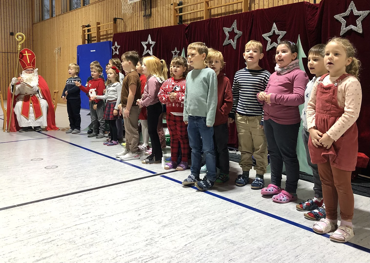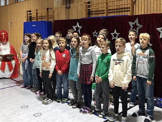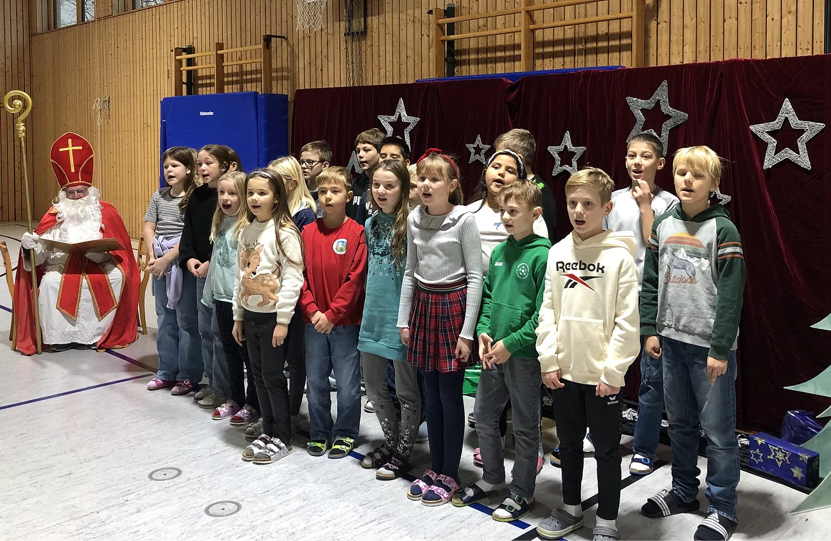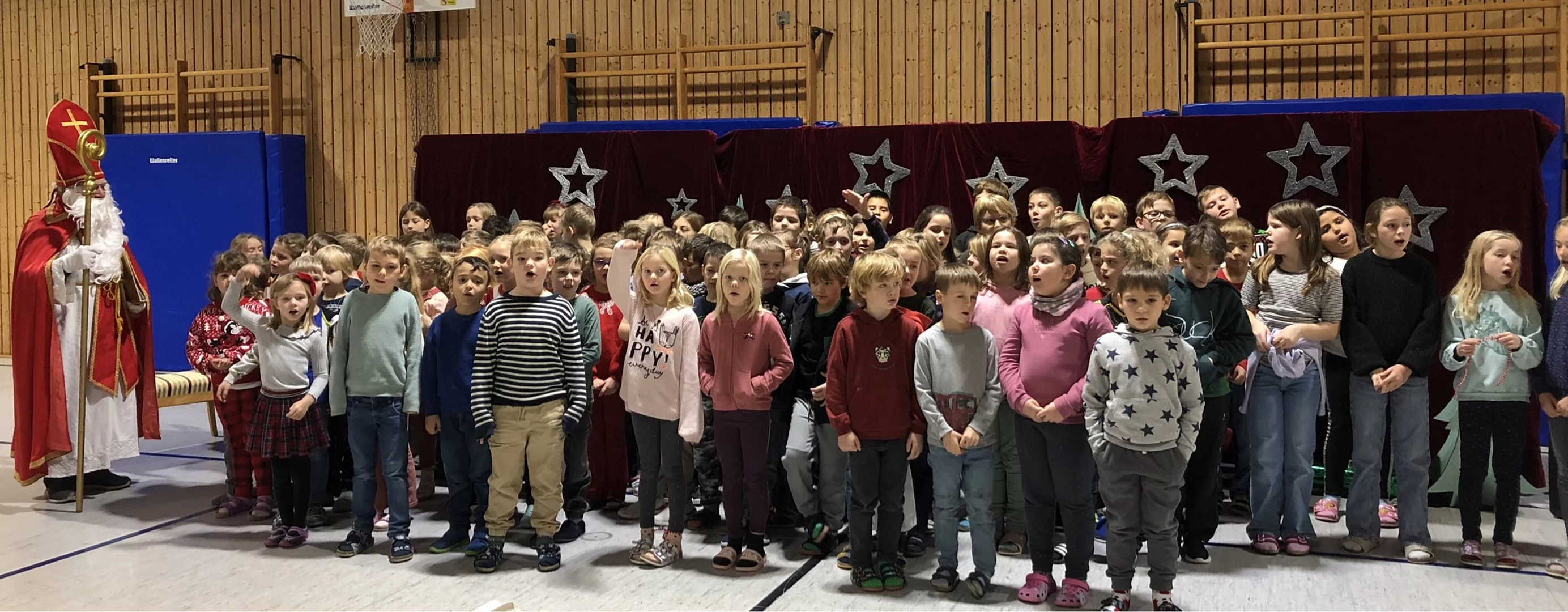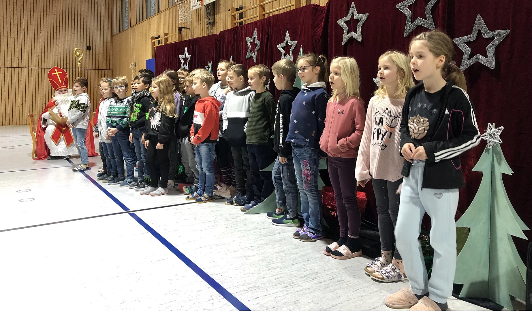 Alle Jahre wieder besucht der Hl. Nikolaus (Erwin Sigl) die Grundschulkinder aller Klassen. Dazu versammelt sich diese am 6.12. gleich zu Unterrichtsbeginn in der festlich geschmückten Turnhalle. Ganz gespannt wartete man auf den heiligen Mann, der nicht lange auf sich warten ließ und seiner Freude deutlich Ausdruck gab, die Schule wieder besuchen zu können. Nun kamen die einzelnen Klassen hintereinander an die Reihe. Zuerst sangen sie dem Nikolaus ein schönes Lied. Danach las der Nikolaus, etwas Gutes und weniger Gutes aus seinem Goldenen Buch vor und ermahnte die Kinder, sich zu bessern, sparte aber auch nicht mit Lob. Anschließend erhielt jedes Kind eine gut gefüllte Nikolaustüte mit einem Buch. Diese Tüten hatten am Vorabend die Mitglieder des Elternbeirates hübsch verpackt. Nach dem gemeinsamen Abschiedslied durften sich die Kinder am Buffet mit Marmeladenbroten und Kinderpunsch bedienen, welche vom Elternbeirat vorbereitet wurden. Der Appetit war groß und alles fand reißenden Ansatz.