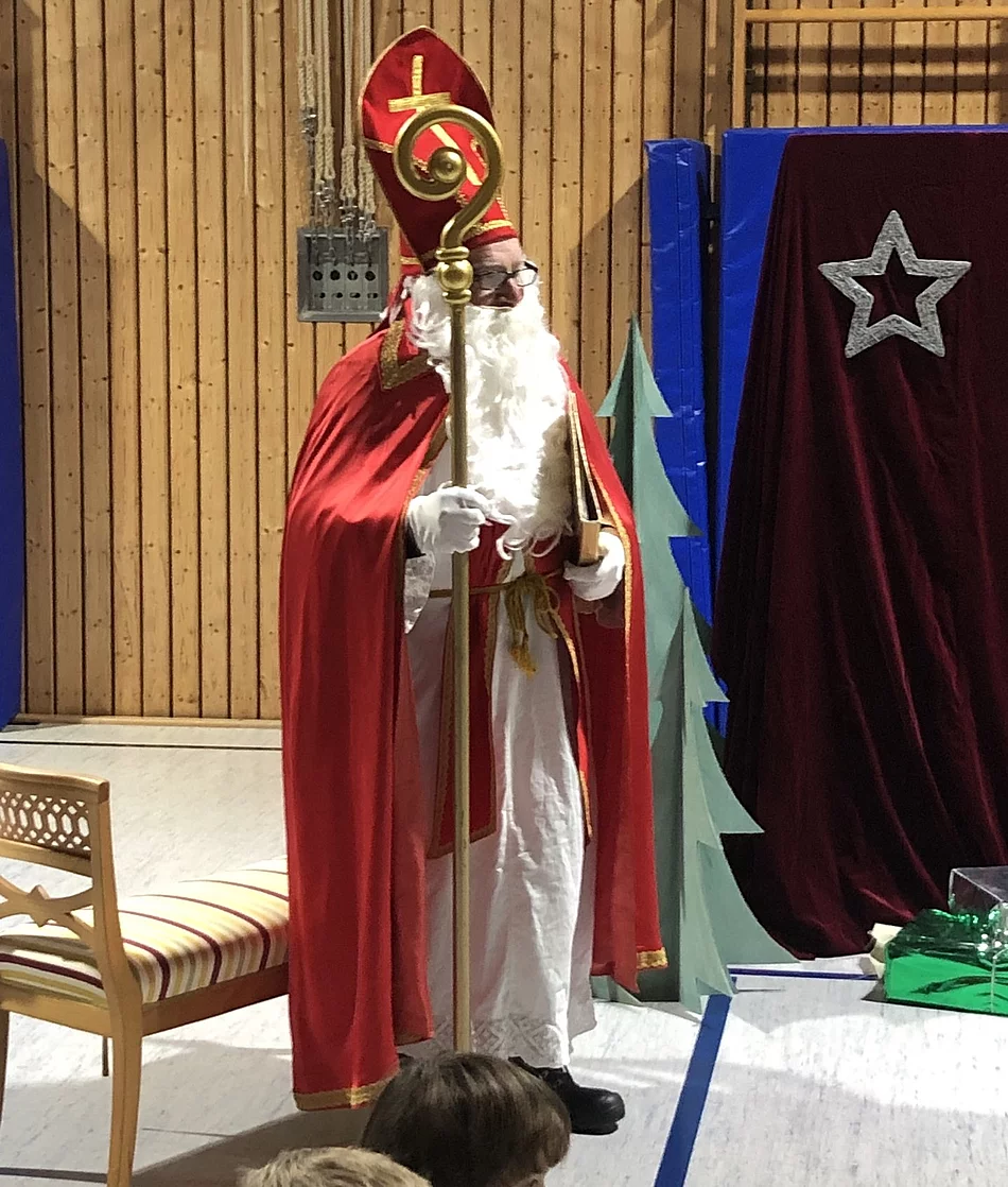 Wie jedes Jahr am 6.12. kam auch heuer wieder der Nikolaus zu Besuch in die Schule. Mehrere Eltern und Großeltern waren der Einladung zu der kleinen Feier gefolgt. Der Hl. Nikolaus (Herr Sigl vom WMSC)) kam bereits am Morgen um 8.00 Uhr. Alle Kinder erwarteten ihn bereits in der Turnhalle. Jede Klasse sang ihm ein Lied, danach las er, was zu den Kindern der einzelnen Klassen in seinem Goldenen Buch geschrieben steht. Neben viel Lob gab es auch ein paar Versprechen abzunehmen, dass manche Dinge sich bessern müssen. Jedes Kind erhielt ein tolles Päckchen mit einem schönen Buch und Leckereien. Nach dem gemeinsamen Abschlusslied gab es für die Kinder Kinderpunsch und Marmeladenbrote vom Elternbeirat. Die 4. Klasse bot noch die Bastelarbeiten an, die beim Nikolausmarkt nicht verkauft werden konnten. Nach der Pause ging der Unterricht wieder weiter.