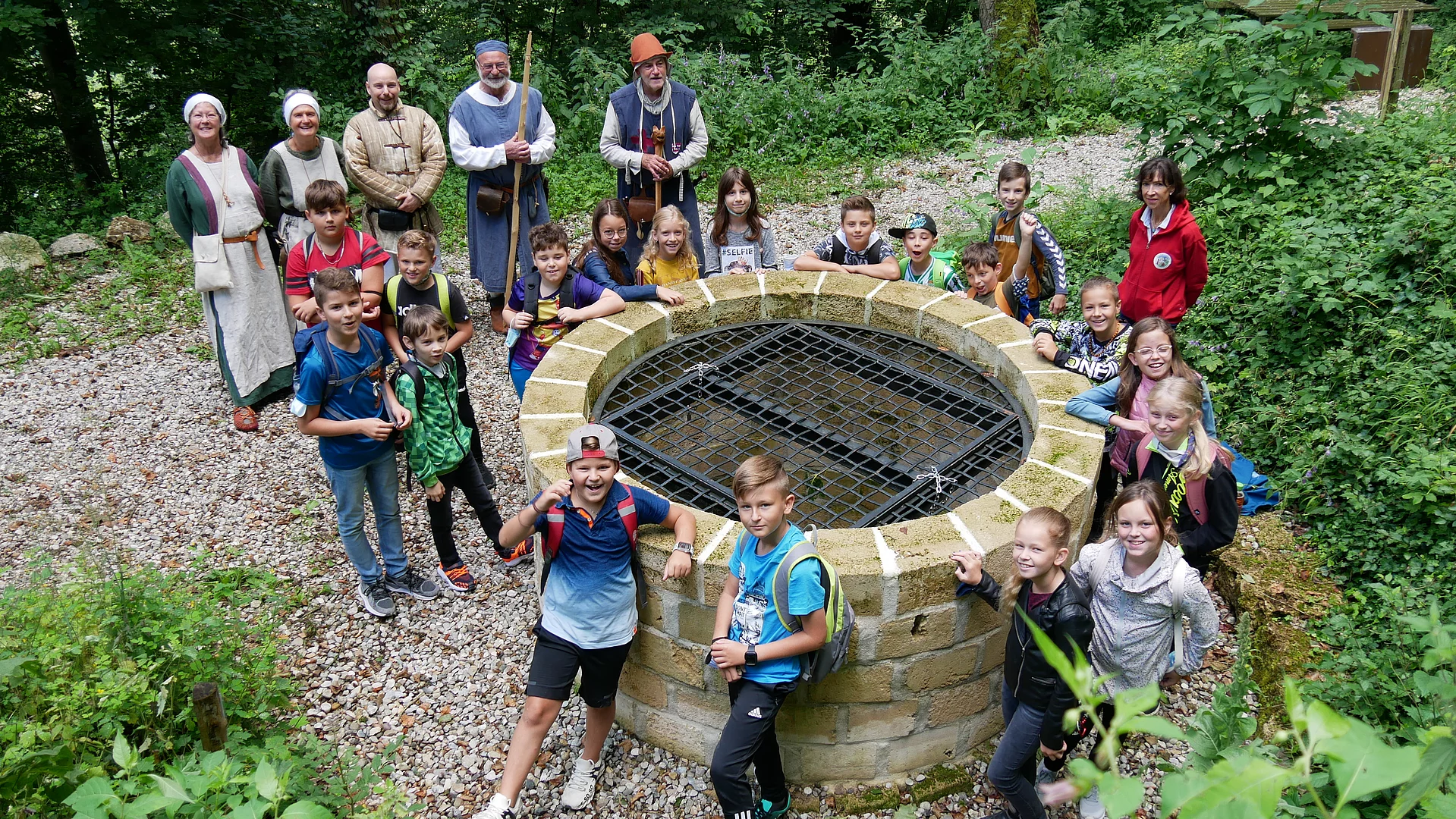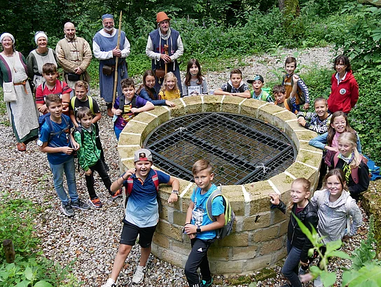 Am nächsten Schulvormittag startete die 4.Klasse im Rahmen des Heimat- und Sachunterrichts zum Gang auf den Julbacher Schlossbeg. Am Parkplatz wurden sie bereits von den mittelalterlich gewandeten Burgfreunden erwartet. Gemeinsam stieg man zum Schlossberg hinauf. Unterwegs wurde immer wieder ein Stopp eingelegt. Zunächst erläuterte Wolf-Dieter Hergeth die einzelnen Kleidungsstücke, die damals getragen wurden, vom Filzhut bis zu den Beinkleidern. Sehr genau wusste er auch über die Lage der einzelnen Mauerteile, der Verläufe von Gräben und der Anordnung der Gebäudeteile sowie deren Ausmaße zu berichten. Relikte konnten passend zugeordnet werden, sodass sich die Kinder alles gut vorstellen konnten, wie die Burg einstmals ausgesehen haben könnte. Ganz oben angekommen zog der restaurierte tiefe Burgbrunnen die Kinder magisch an. Am Lagerfeuer durften alle noch die Fundstücke bestaunen, die bisher auf dem Burgareal gefunden wurden. Lanzenspitzen, Pfeilspitzen, handgeschmiedete Nägel, aber auch Schmuck, Haarnadeln und Feuersteine waren darunter. Dass es ein Ritter im wahrsten Sinne des Wortes nicht leicht hatte, spürten die Kinder, als sie ein Kettenhemd hochheben durften. Danach wurde“ Ritter Jürgen“ mit vereinten Kräften angezogen, der mit seinem Schwert sogleich in den Kampf zog, um Melonen für die jungen Besucher zu „köpfen“. Ebenfalls keine leichte Aufgabe ist es, einen Bogen zu spannen. Das konnten die Kinder an einem richtigen Bogen der Bogenschützen ausprobieren. Höhepunkt des Ausflugs war die Begehung der unterirdischen Gänge mit der Taschenlampe. Die wunderlichen Verzweigungen und das Gängesystem sowie die Kälte dort wurden zu einem besonderen Abenteuer. Nach dem Eintrag ins Gästebuch ging die Klasse mit vielen kleinen Erinnerungsstücken wie Tuffsteinen, Knochenresten und sogar einem antiken Eisennagel wieder zurück ins Tal.