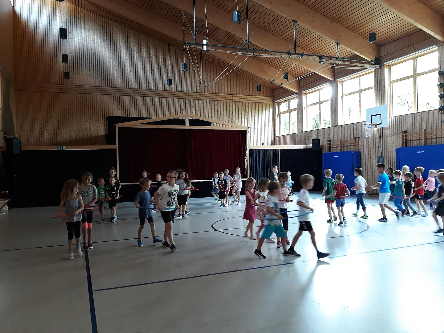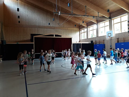 Nach einem kurzen “Kennenlernen“ im Glashaus, gingen alle gemeinsam in die Turnhalle. Dort durften sich die Schulanfänger unter Anleitung ihrer „Schulpaten“ zu dem „Märchen von der kleinen Dampflok Emma“ bewegen.