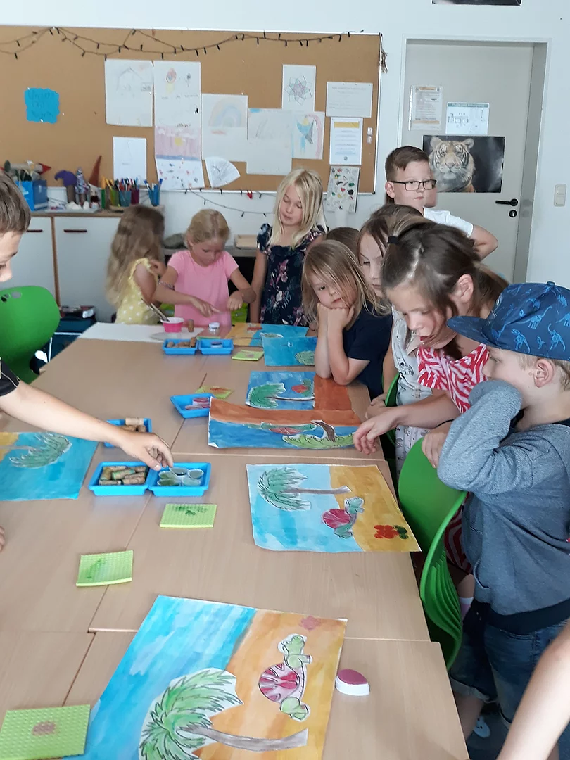 Im Klassenzimmer der 2. Klasse wurde dann die Geschichte „Kröti und die Zauberblume“ vorgelesen. Die Schulanfänger malten nun mit Hilfe ihrer „Schulpaten“ die leuchtend rote Schildkröte Kröti mit Pastellkreiden aus und klebten sie auf einem Bild auf. Den Hintergrund dieses Bildes hatten die Kinder der 2. Klasse bereits einige Tage vorher für ihre „Patenkinder“ gemalt. Zum Schluss wurde eine selbst erfundene Zauberblume mit einem Korken und Stempelkissen auf das Bild gestempelt und mit Glitzeracrylfarbe verziert.