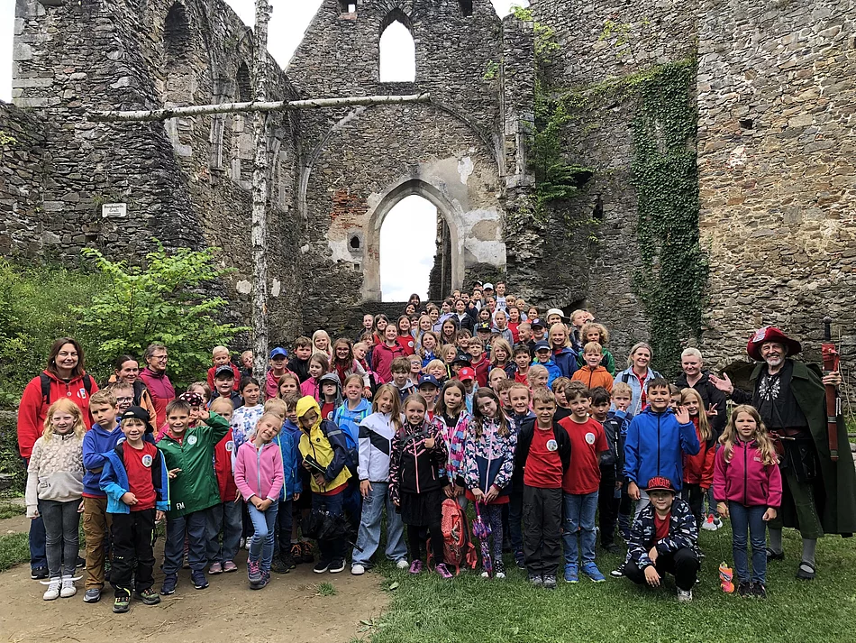 Geschichte hautnah erleben durften die Kinder und Erwachsenen der Grafen von Schaunberg Schule in Julbach. Im vierjährigen Rhythmus fährt die gesamte Schulfamilie zu ihren Wurzeln, die in Österreich liegen, denn die Julbacher Grafen sind schon lange Namensgeber für die Grundschule in Julbach. Ziel war daher die Ruine Schaunberg auf der Anhöhe bei Schaumburg in Eferding, die größte Ruine in Oberösterreich. Dort angekommen wurden sie bereits von Hans von Schaunberg alias Hubert Krexhammer empfangen. Gewandet in der typischen Kleidung des 15. Jahrhunderts erzählte er vom Leben auf der Burg. Die sehr gut erhaltenen Gebäudeteile gaben ihm Anlass, anschaulich zu beschreiben, wie es damals hier ausgesehen hatte. 17 500 Quadratmeter umfasst die Fläche der Ruine, manche Wehrmauern sind bis fünf Meter dick. Von einer Anhöhe der Burgmauer konnten die jungen Besucher einen guten Überblick über die umfangreichen Gebäudeteile erhalten und den Ausblick über die Donau genießen. Im Gewölbe unter der Kapelle gab Krexhammer die Sage von der weißen Frau zum Besten. Er verstand es außerordentlich gut, so zu erzählen, dass die Kinder gebannt zuhörten. An der Lagerfeuerstelle wurde noch die Geschichte der Erscheinung eines drachenähnlichen Wesens erzählt. Auch hier wusste er noch Wundersames zu erzählen, das den Zuhörern leichte Schauer über den Rücken jagte. Neu für die Kinder war die Tatsache, dass es damals schon ein Warenhaus auf der Burg gab und man konnte sich ob der lebendigen Erzählung sehr gut vorstellen, wie das Leben auf der Burg wohl ausgesehen haben mag. Die mutigen Kinder wagten noch einen Aufstieg auf den 32 Meter hohen Bergfried. Die Belohnung für das Überwinden der 189 Stufen stellte der einmalig schöne Blick ins weite Donautal dar. Hier wurde klar, dass die Burg als „Burg Schaunberg“ genannt wurde. Vor der Heimfahrt gab es noch einen Abstecher zum Schloss der letzten Nachfahren der Julbacher Grafen. Bereits vor Eintreten in den Schlosshof entdeckten die Kinder das ihnen gut bekannte Familienwappen derer von Schaunberg. Das Schloss dient dem Oberhaupt der Familie Starhemberg als Wohnsitz. Daneben beherbergt es drei Museen und wird als Kulturzentrum Eferdings genutzt. Nach einem Rundgang im schönen Innenhof wurde noch ein Erinnerungsfoto geschossen.