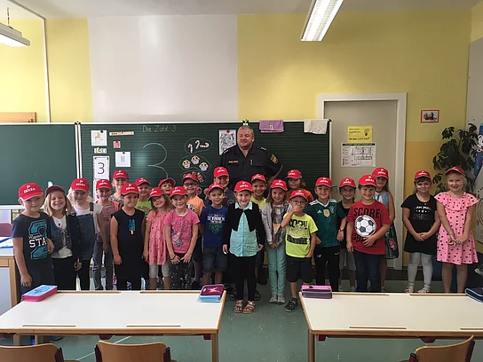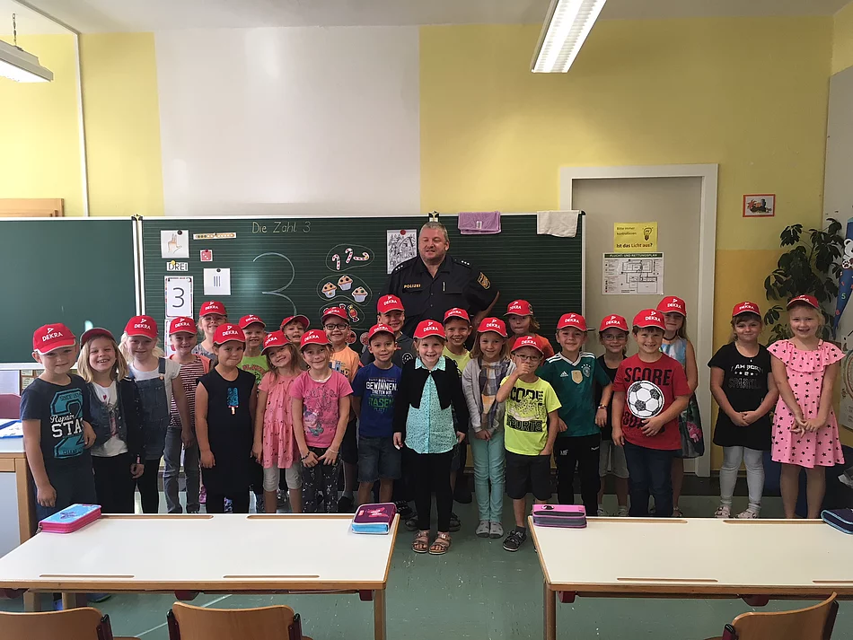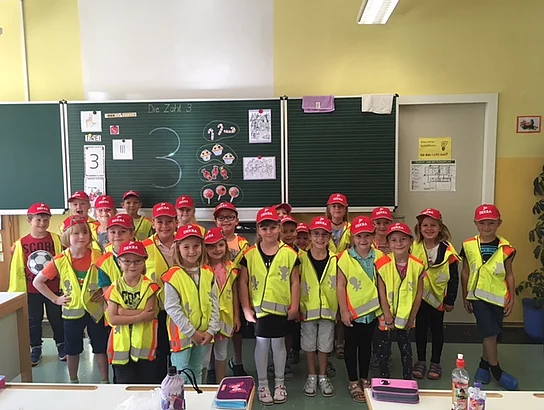 Die Schulanfänger wurden für den Straßenverkehr ausgestattet: Herr Mayer von der Polizei besuchte die Erstklässler und brachte Kappen mit Reflektoren mit. Außerdem bekam jeder von der ADAC Stiftung eine neongelbe Sicherheitsweste, mit der man auch an den dunklen Tagen auf große Distanz gut zu sehen ist. Denn gerade für Kinder gilt: Sichtbarkeit = Sicherheit.