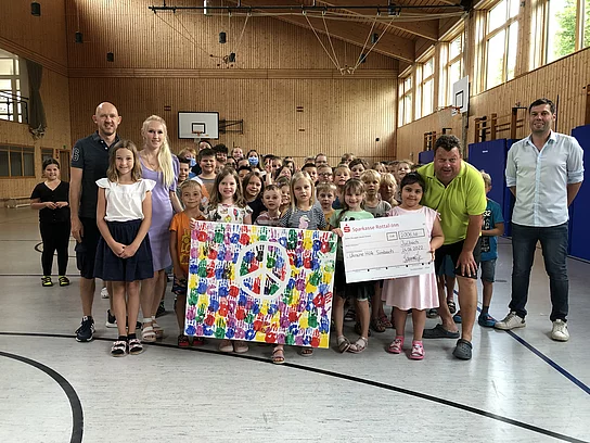 Am Freitag besuchte Stefan Lehner zusammen mit Snizhana Brosowski vom Helferkreis in Simbach die Grafen von Schaunberg Schule, um sich bei den fleißigen Kindern und damit auch bei den Familien persönlich zu bedanken. Der Hindernisparcour rund um das hügelige Schulgelände, den der Elternbeirat aufgestellt hatte, war bei sommerlichen Temperaturen durchaus anstrengend. So versammelten sich alle Kinder in der Turnhalle bei der symbolischen Scheckübergabe. Diese Gelegenheit nutzte Lehner, den Kindern von der Arbeit und der Verwendung der Spendengelder zu berichten. Karoline Lenk, Mitglied des Helferkreises und Mitglied des Elternbeirates an der GS Julbach stellte den Kontakt nach Simbach her. Sie hatte mit allen Beteiligten des Spendenlaufs als Zeichen der Verbundenheit ein Bild mit den Handabdrücken erstellt, welches ebenfalls mit besten Wünschen an Lehner und Brosowski weitergegeben wurde