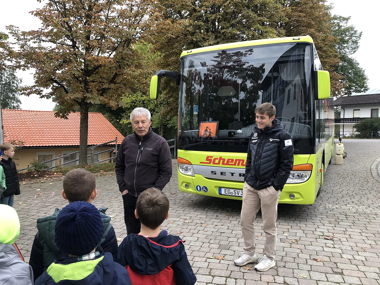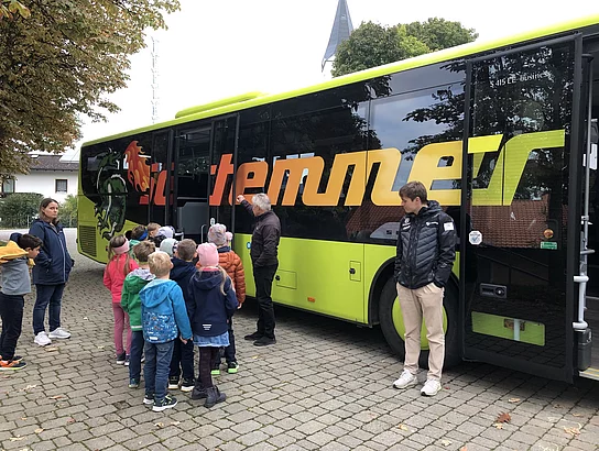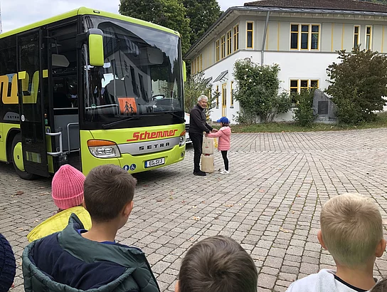 Gleich zu Beginn des neuen Schuljahres startete die Verkehrserziehung in den ersten Klassen. Rupert und Maximilian Schemmer vom zuständigen Busunternehmen wiesen die Kinder der ersten Klassen in die richtigen Verhaltensregeln an der Bushaltestelle und im Bus ein. Zunächst ging es um das richtige Anstellen ohne Gedränge und das geordnete Platznehmen im Bus. Dass auch das Sitzenbleiben wichtig ist, wurde anhand der Puppe “Paula” demonstriert, die bei einer Bremsung nach vorne katapultiert wurde. Das sichere Überqueren der Straße in Busnähe wurde ebenso anhand eines negativen Verhaltens von “Paula” demonstriert, welches eindrucksvoll zeigte, wie gefährlich es ist, vor oder hinter einem Bus die Straßenseite zu wechseln. Alle Kinder versicherten, dass sie in Zukunft aufpassen werden, um sicher im Straßenverkehr unterwegs zu sein. Vielen Dank an die Firma Schemmer, die die Grundschule immer wieder gerne unterstützt und sich der Kinder annimmt.