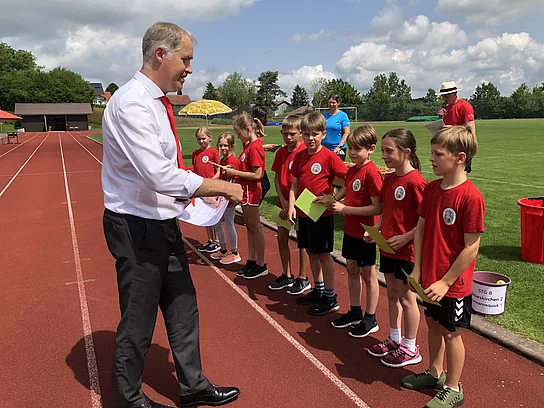 Nach zwei Jahren Coronapause konnte wieder die Landkreisolympiade in Pfarrkirchen stattfinden. Auch die Grundschule Julbach beteiligte sich mit einer Abordnung daran. Aus den 3. und 4.Klassen dürfen jeweils zwei Mädchen und Buben teilnehmen. Nina Hawly, Milena Nebauer, Hannah Rohrer, Lea Haunreiter, Maxi Danzer, Michael Fuchs, Maxi Fuchs und Raphael Kainz durften die Schule Julbach vertreten. Als Betreuer und Fahrer erklärten sich Frau Rohrer und das Ehepaar Hawly bereit. Sechs Leichtathletikspiele mussten von den Teilnehmern auf Zeit absolviert werden. Alle gaben ihr Bestes und am Ende schafften unsere Sportlerinnen und Sportler von zehn Mannschaften den 6. Platz. Aufgrund der erschwerten Trainingsbedingungen kann dies als sehr gute Platzierung anerkannt werden. Glückwunsch!