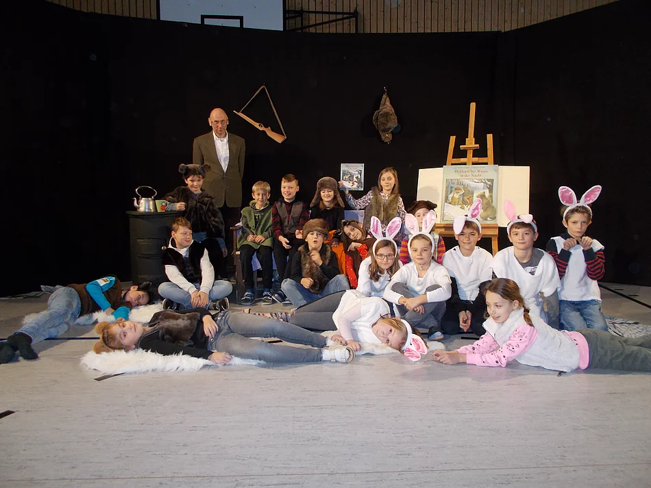 Zum Einstieg in die Lesewoche kam das mobile "Theater Spielzeit" an die Grundschule. Gernot Ostermann spielte mit den Kindern in einer interaktiven szenischen Lesung mit Theaterworkshop das Kinderbuch "Es klopft bei Wanja in der Nacht". Dieses Wintermärchen bot sich geradezu an, mit den verschiedenen Tierrollen nachgespielt zu werden. Schnell durften die Kinder sich mit Tierfellen und Zubehör verkleiden, um selbst Darsteller des Buches zu werden. Der Workshop wurde in jeder Klasse durchgeführt, sodass jedes Kind einmal in eine Rolle schlüpfen durfte. Die Handlung, der Text in Reimform und die Charaktere der verschiedenen Tiere gefielen den Kindern sehr gut. Herr Ostermann verstand es ebenso, die Geschichte sehr lebendig in Zusammenarbeit mit den Kindern zu spielen und freute sich über die begeisterte Teilnahme der Schülerinnen und Schüler.