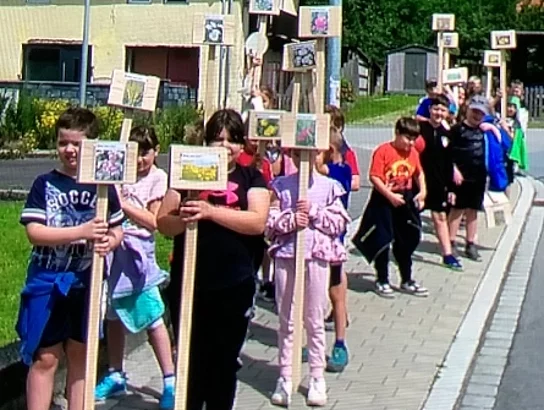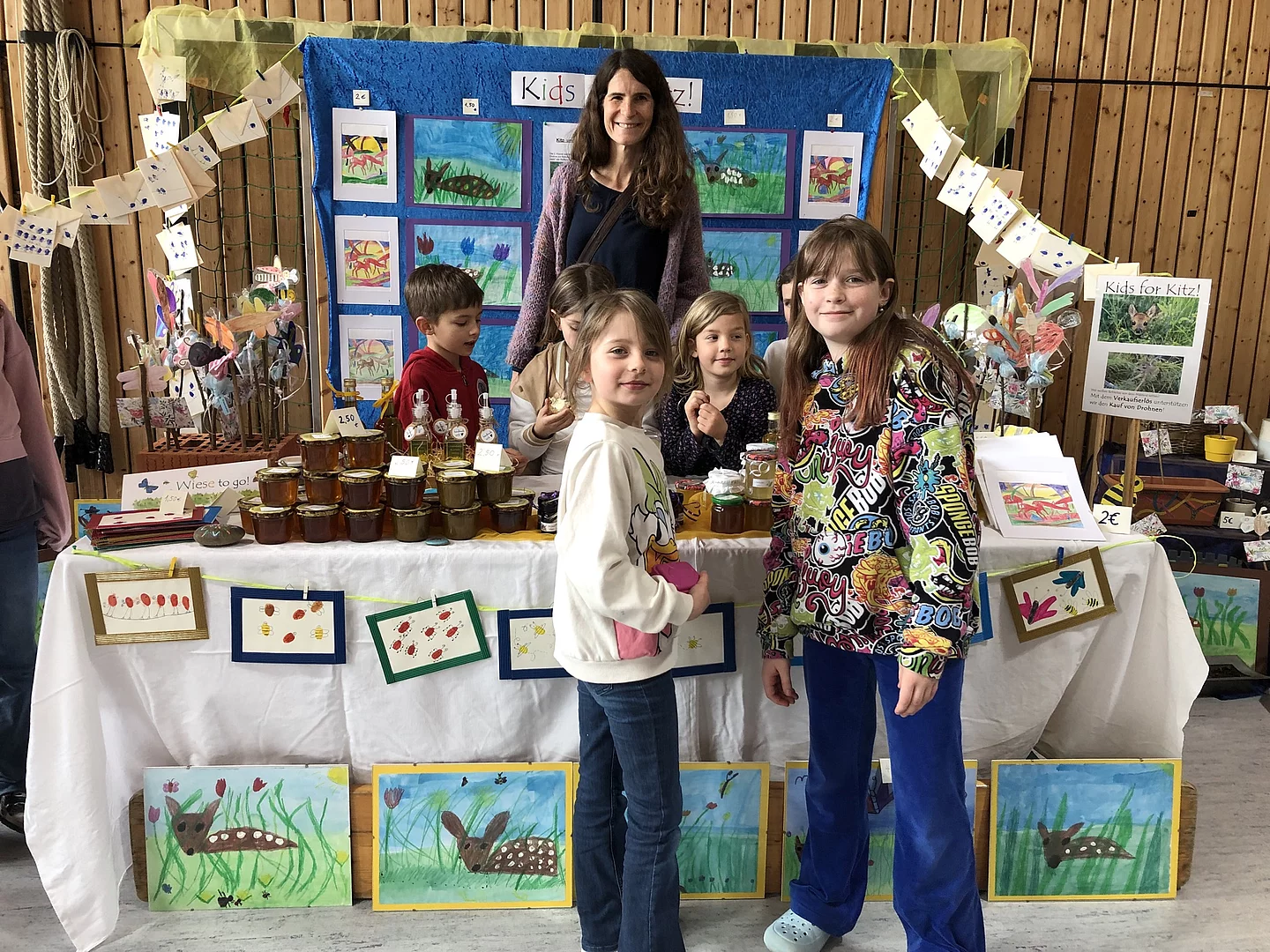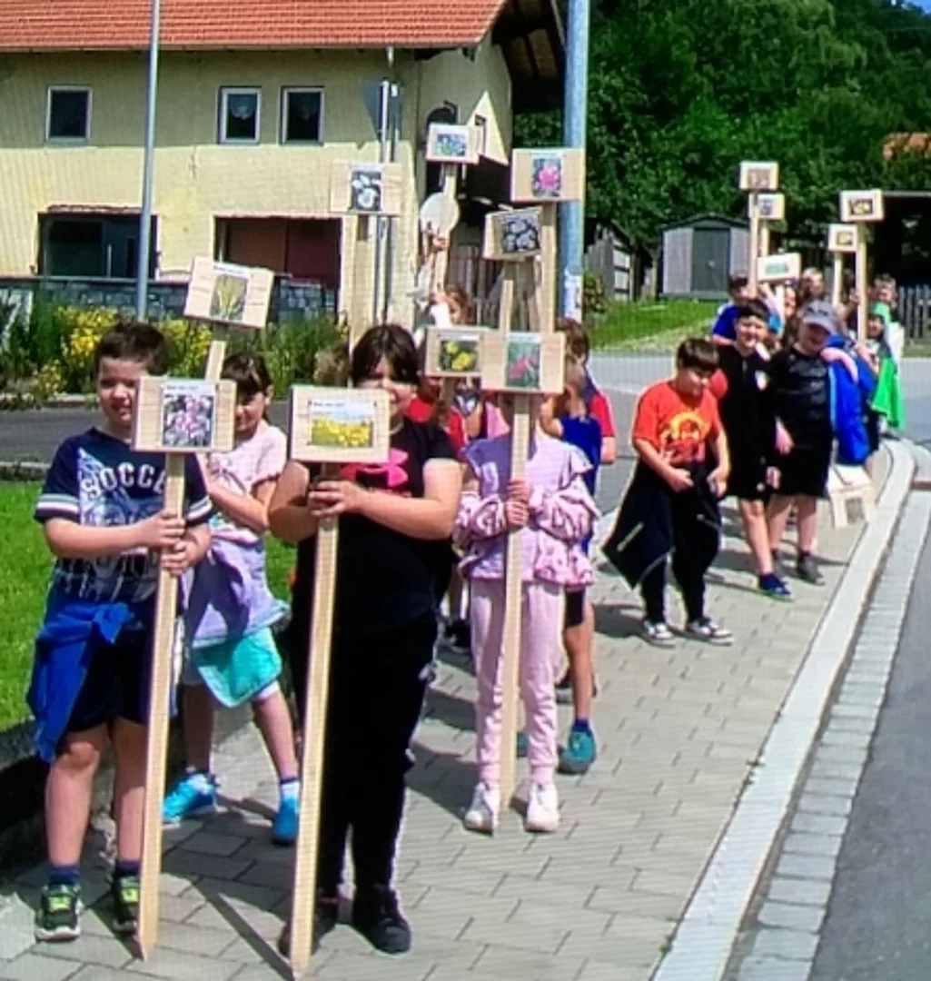 Jedes Jahr beteiligt sich die Grafen von Schaunberg Schule am Umwelt- und Sozialpreis des Landkreises. In diesem Schuljahr führte die 2. Klasse mit Klassenleiterin Gertrud Nothaft ein umfangreiches Wiesenprojekt unter dem Titel „kids for Kitz“ durch. Ziel war es, Geld zu erwirtschaften, um für ein Drohnenprojekt zur Rehkitzrettung zu spenden. Dabei sollte auch die Biodiversität in der Schulumgebung in den Mittelpunkt gerückt werden. Die Kinder forschten auf der nahe gelegenen „Biene Maja-Wiese“, bestimmten und fotografierten Wiesenblumen und kleine Tiere. Am naturwissenschaftlichen Tag wurden kleine Insektenhotels gebaut als Unterschlupf für die Wiesenbewohner. Am Pflanzenflohmarkt hatte die 2. Klasse zusammen mit ihrer Klassenlehrerin einen sehr ansprechenden Verkaufsstand aufgebaut. Viele hatten mitgeholfen, um selbst gemachte Sachen wie Duftöl, Löwenzahnsirup und Löwenzahnessig für den Verkauf herzustellen. Daneben fertigten die Kinder Blumenkarten, Rehkitzbilder und Wiesenblumenkästen an. Am Ende nahm die 2. Klasse 402 € ein, welche dem Drohnenprojekt gespendet wurden. Mithilfe des Elternbeiratsmitgliedes René Mitsch konnten in die wilden Blühstreifen entlang der langen Dorfstraße aufklappbare Bestimmungstafeln aus Holz gesteckt werden. Beschriftet wurden diese von den Kindern mit einem Foto der Blume, deren Name und Informationen dazu. Nun können sich alle, die entlang der Hauptstraße gehen, informieren, welche Blumen dort wachsen. Ein Quiz zu den Wiesenblumen spornte alle Schulkinder und deren Familien an, die Blühstreifen zu erkunden. Mit dem Projekt nahm die 2. Klasse an der Feier zur Verleihung des Umwelt- und Sozialpreises teil und konnte einen Geldpreis für die Schule in Empfang nehmen.
