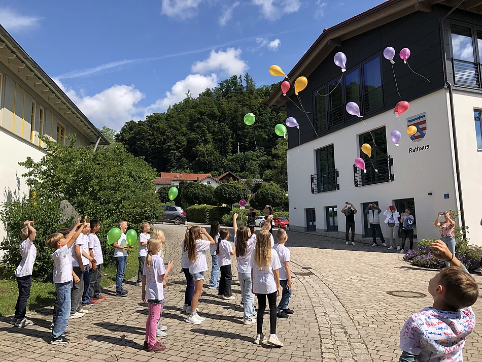 Am letzten Schultag wurden wieder die Kinder der 4. Klasse nach dem Abschlussgottesdienst verabschiedet. Im Rondell fand eine kleine Feier statt, bei der sich auch Bürgermeister Schusterbauer einfand. Mit Tanz, Lied und dem Steigen der Luftballons mit guten Wünschen nahmen alle Abschied und gingen in die Sommerferien.