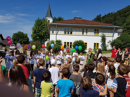 Am letzten Schultag wurden die Kinder der vierten Klasse ganz besonders verabschiedet. Für sie war es der letzte Tag an der Grundschule Julbach. Die schulischen Wege trennen sich nun nach Kirchdorf, Simbach und Burghausen. Schon am Morgen begannen die Schülerinnen und Schüler mit dem Sammeln von Unterschriften auf ihren T-Shirts. Nach dem Gottesdienst versammelte sich die Schulfamilie am Pausenhof und das Lied "Ferienzeit" wurde gesungen. Als Abschluss bekam jeder Viertklässler einen Luftballon mit einem persönlichen Gruß. Gemeinsam ließen alle ihre Luftballone steigen. Im strahlend blauen Himmel verschwanden diese schließlich. Alles Gute für die Zukunft!