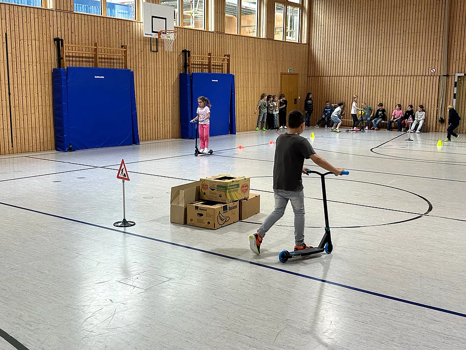 Mit den Rollern bewiesen die Kinder Geschicklichkeit, indem sie Slalom fuhren, enge Stellen bewältigten und an Hindernissen vorbeifuhren bzw. -schoben.