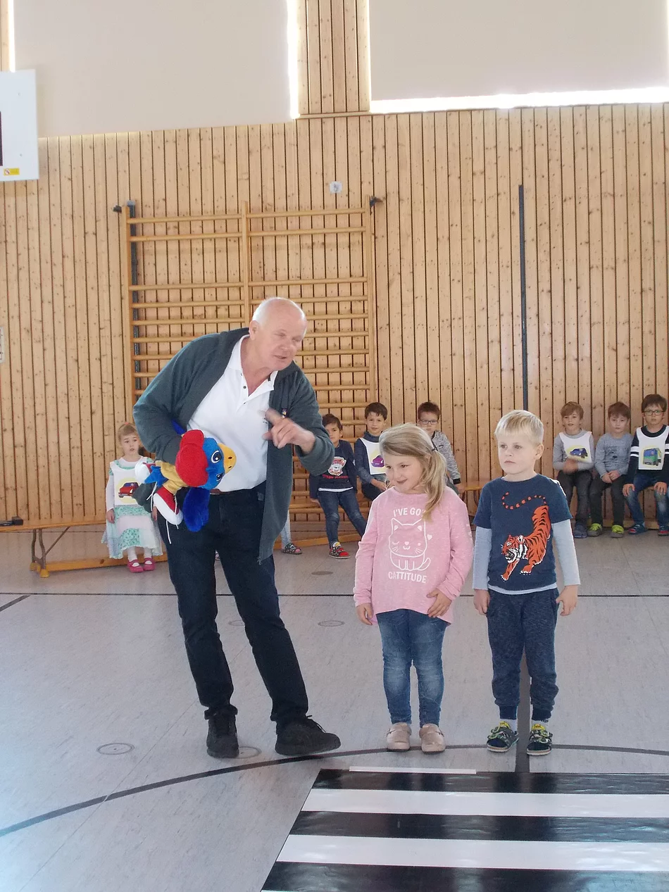 Am Mittwoch kam Herr Max Rutzinger, ein ehrenamtlicher Mitarbeiter des ADAC, zu den Kindern der 1. Klasse und führte mit ihnen ein Verkehrssicherheitsprogramm durch. Zunächst wurden an Hand von Bildern gefährliche Situationen im Straßenverkehr besprochen. Im praktischen Teil übten die Kinder dann an einem in der Turnhalle aufgebautem Kreuzungsbereich mit Fußgängerüberweg und Ampel das richtige Verhalten abwechselnd als Fußgänger und Autofahrer aktiv ein. Besonders wichtig war Herrn Rutzinger dabei der Blickkontakt zwischen Fußgänger und Autofahrer am Zebrastreifen. Am Ende des Verkehrssicherheitsprogramms erhielten die Kinder eine Urkunde und einen Aufkleber.
