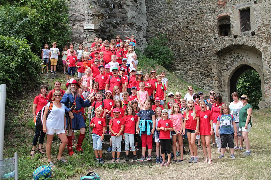 Am zweiten Wandertag machte sich die ganze Schulfamilie auf den Weg zu den Ursprüngen der Geschichte. Die Kinder sollten einmal erfahren, woher ihre Grundschule den Namen hat. So fuhr man zuerst nach Eferding, wo uns Fürst Starhemberg, einer der letzten Nachkommen der Schaunberger empfing. Es erwartete die Kinder eine Jause, dann durften wir alle prächtigen Räume des Schlosses besichtigen. Bevor wir uns auf den Weg zur Burgruine machten, besichtigten wir noch die Kirche. Oben bei der Ruine erwartete uns schon Hans von Schaunberg, geboren 1471, und freute sich, dass er "Verwandte" begrüßen durfte. Er führte uns durch die imposante Ruine und erzählte sehr stimmungsvoll von der "weißen Frau" und vom traurigen Ende seiner Familie. Auch ein Fernsehteam begleitete unseren Besuch und erstellte einen kurzen Filmbeitrag. Allen Beteiligten machte der Ausflug große Freude und mit vielen interessanten Eindrücken kehrte man am Nachmittag wieder nach Hause. Hier der Bericht auf BTV zum Besuch in Eferding.