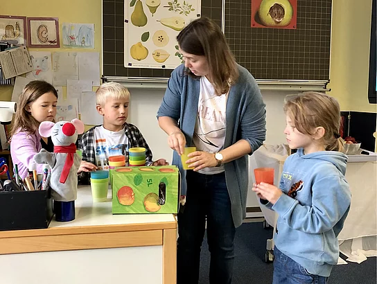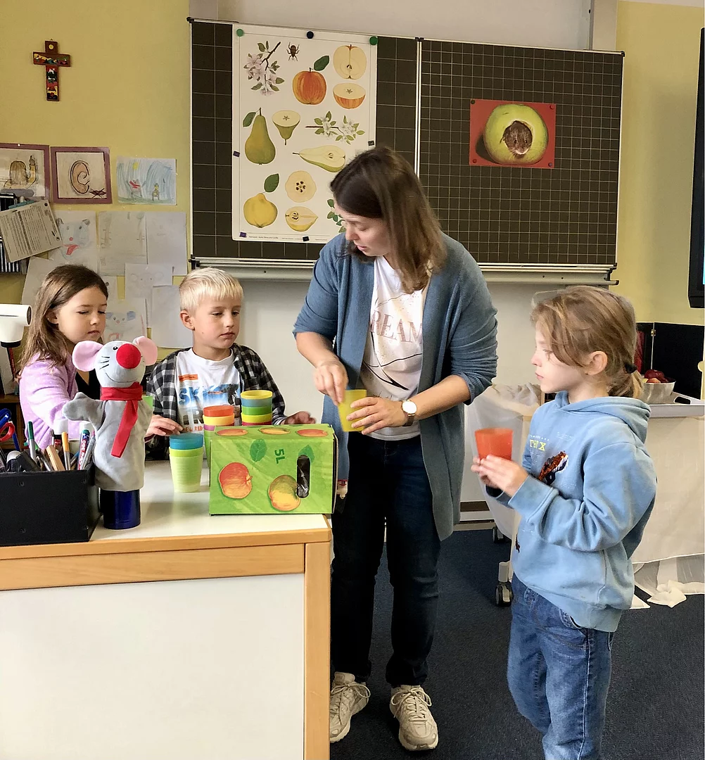 Um bei der Auswahl von frischen Produkten nachzudenken, wurde der Blick auf einheimische und saisonale Obstsorten gerade jetzt im Herbst gelenkt. Als ein Beispiel wurde der heimische Apfel in den Mittelpunkt gerückt. Die Sensibilisierung für das Wachsen und Gedeihen in der Natur wurde im Kamishibai-Theater anschaulich vermittelt. Neben der Betrachtung des Baumes und dem Aufbau der Frucht konnten verschiedene Produkte und vor allem der Saft getestet werden, den Lehrerin Martina Dobler aus heimischem Anbau spendete.