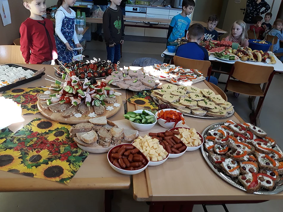 Nachdem im Herbst für alle Kinder das gesunde Frühstück im Mittelpunkt der Ernährungserziehung stand, sollte nun eine Zwischenbilanz gezogen werden: Wie hat sich mein Frühstücksverhalten verändert? Esse ich nun andere Dinge, die ich vorher nicht kannte? Achte ich auf gesunde Lebensmittel? Da die zweite Klasse im HSU-Unterricht aktuell das Thema gesunde Ernährung mit Obst und Gemüse auf dem Stundenplan stehen hat, bereiteten einige fleißige Muttis von Kindern der 2. Klasse ein ausgezeichnetes Frühstücksbuffet für alle Schulkinder, das keine Wünsche offen ließ. Vom Gemüsemann über bunte Obstspieße, belegte Brote, Säfte und Milchprodukte reichte die Angebotspalette. Zur großen Pause durften sich alle bedienen, und man konnte feststellen, dass gesunde, vollwertige Nahrungsmittel absolut beliebt sind. Das Team der Grundschule hofft, dass das Frühstücksverhalten nachhaltig positiv beeinflusst werden konnte und bedankt sich ganz herzlich bei allen Helferinnen, die diese Aktion ermöglicht haben.