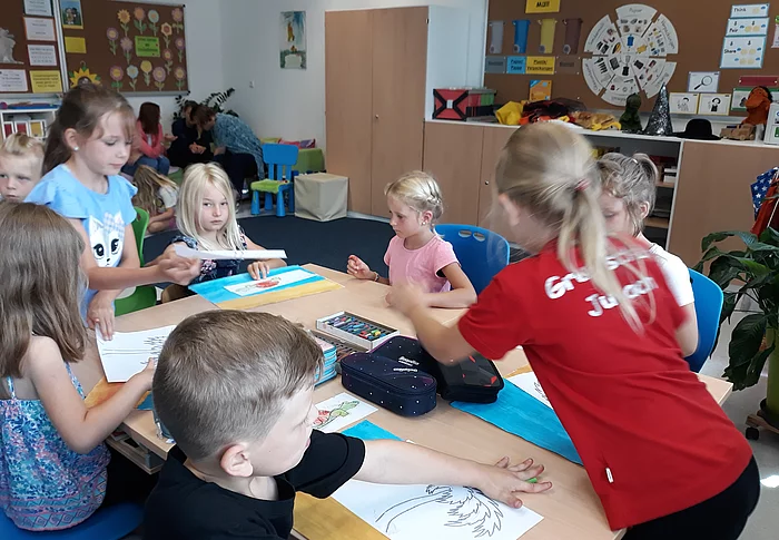 Anfang Juli wurden die Schulanfänger von den Kindern der 2. Klasse zu einem Schnuppertag in die Grundschule eingeladen. Nach einem kurzen “Kennenlernen“ im Glashaus, gingen alle gemeinsam in die Turnhalle. Dort durften sich die Schulanfänger unter Anleitung ihrer „Schulpaten“ zu dem „Märchen von der kleinen Dampflok Emma“ bewegen. Die gemeinsame Pause mit allen Kindern der Grundschule machte den künftigen Schulkindern viel Spaß. Im Klassenzimmer der 2. Klasse wurde dann die Geschichte „Kröti…