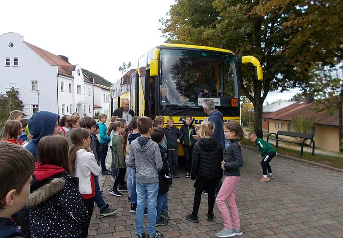 Zu Beginn des neuen Schuljahres wurden die Schulkinder von der Firma Schemmer im richtigen Verhalten beim Fahren mit dem Bus unterwiesen. Herr Rupert Schemmer und sein Kollege nahmen sich Zeit, um den Kindern das richtige, zeitsparende Anstellen beim Einsteigen zu zeigen. Dann konnten die Kinder eindrucksvoll erleben, was passiert, wenn der Busfahrer plötzlich abrupt bremsen muss. Deshalb sollen die Kinder immer ordentlich auf dem Platz sitzen bleiben. Der Film "Hallo Busfahrer" verdeutlichte…
