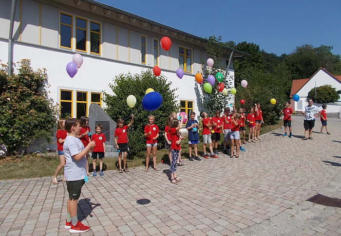 Wie immer am letzten Schultag fand nach dem Abschlussgottesdienst die Verabschiedung der Schüler aus der 4. Klasse statt. Im Rondell versammelten sich alle Kinder und sangen ein Abschiedslied für die 4. Klasse. Bürgermeister Buchbauer und Rektorin Katharina Hornung gaben noch die besten Wünsche mit auf den Weg. Anschließend erhielt jeder einen Luftballon mit einem guten Wunsch aus den Händen der Zweitklässler. Auf Kommando stiegen die Ballons hoch in den Himmel und verschwanden mit der Hoffnung…