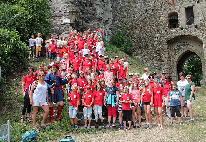 Am zweiten Wandertag machte sich die ganze Schulfamilie auf den Weg zu den Ursprüngen der Geschichte. Die Kinder sollten einmal erfahren, woher ihre Grundschule den Namen hat. So fuhr man zuerst nach Eferding, wo uns Fürst Starhemberg, einer der letzten Nachkommen der Schaunberger empfing. Es erwartete die Kinder eine Jause, dann durften wir alle prächtigen Räume des Schlosses besichtigen. Bevor wir uns auf den Weg zur Burgruine machten, besichtigten wir noch die Kirche. Oben bei der Ruine…